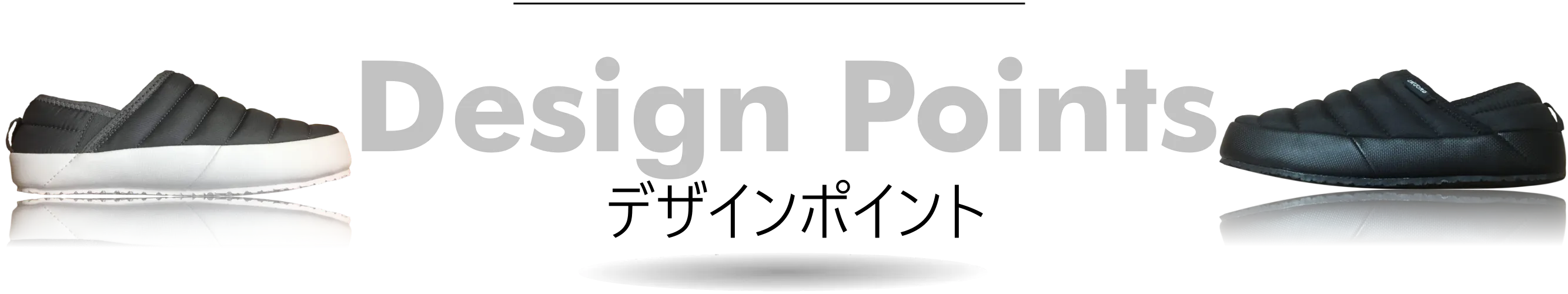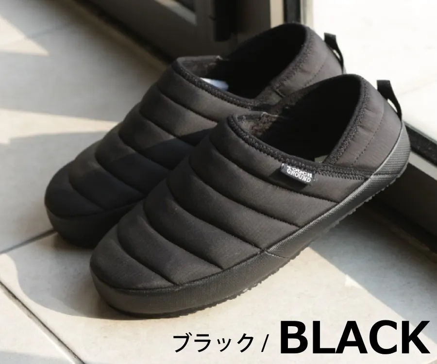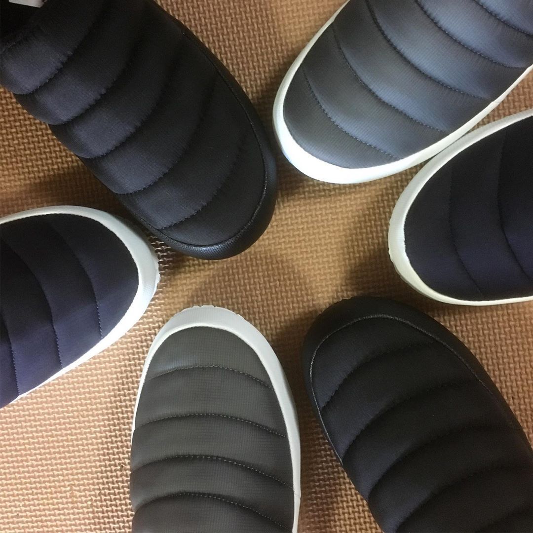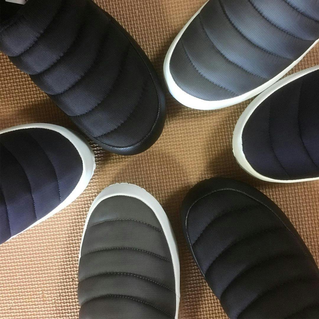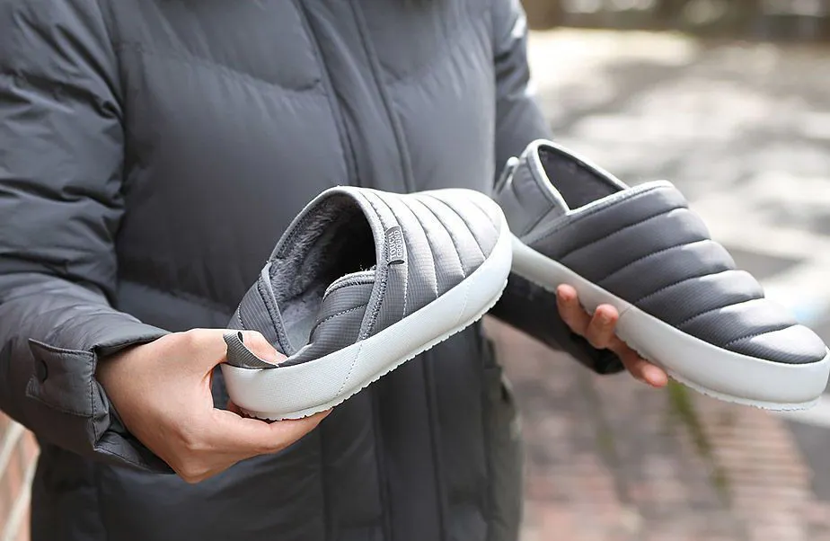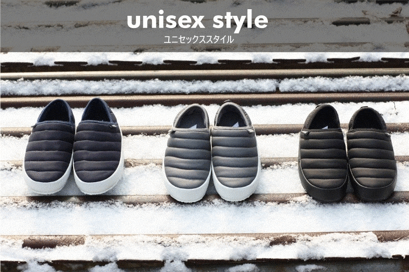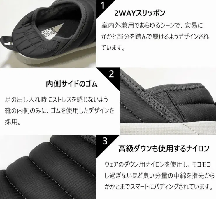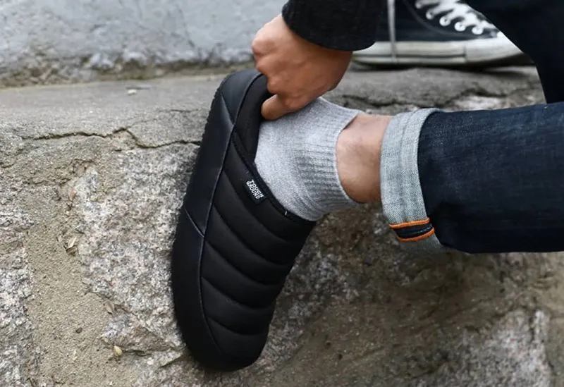 高級ダウンウェアにも使用される軽量ナイロンを使用して、厚断熱材コットン補強材を挿入したバンハンファです。屋内・屋外兼用を意識し安易にかかと部分を踏んで履けるようデザインされています。