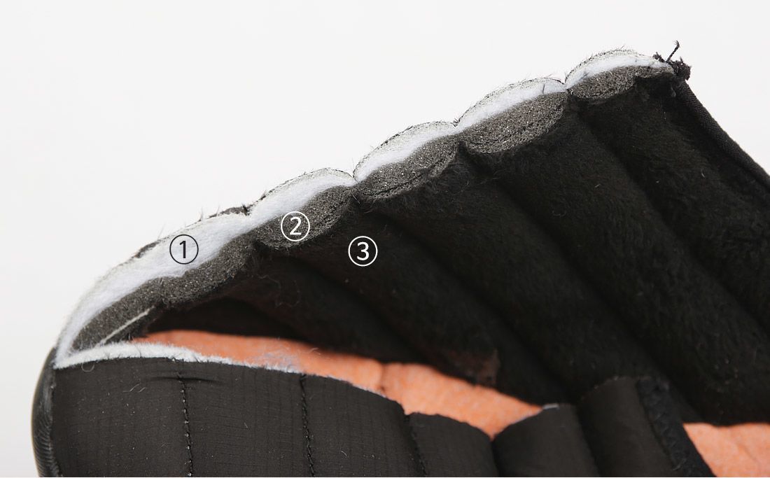 断熱材コットンの位置を固定し、アッパーと足の間に緩衝材としての役割をし、装着時に自然に足を包み込んでくれる効果があります。