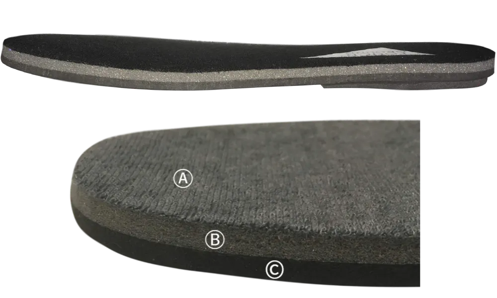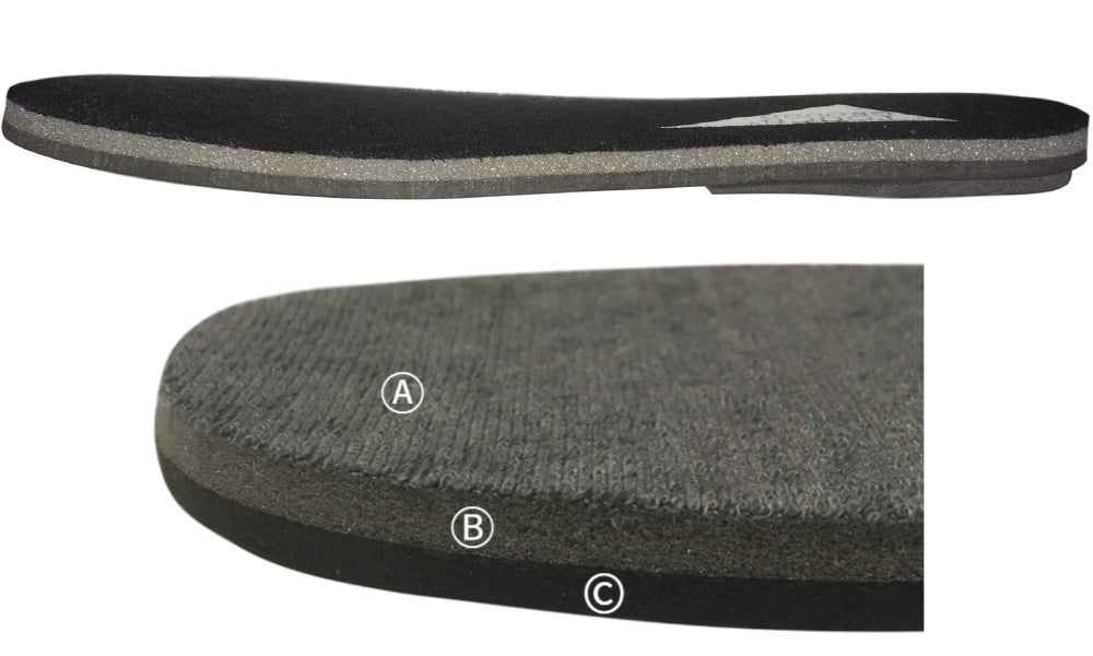 クッション性の高いのあるスポンジメモリーフォームを中間挿入して、着用時に自然にフィットするように、足の形に合わせて変形がされ、より快適なグリップ性を確保します。