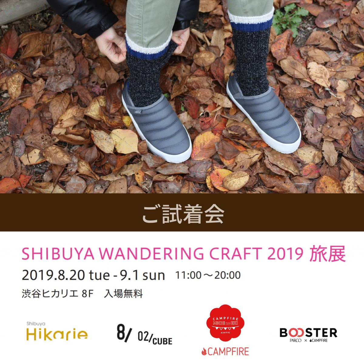渋谷ヒカリエで開催中の【SHIBUYA WANDERING CRAFT 2019】 ~CAMPFIRE MICHI no EKI~にて、展示中の弊社プロジェクト製品「ボンバーミュールスリッポン」のご試着会を開催致しますので、ご案内させて頂きます。