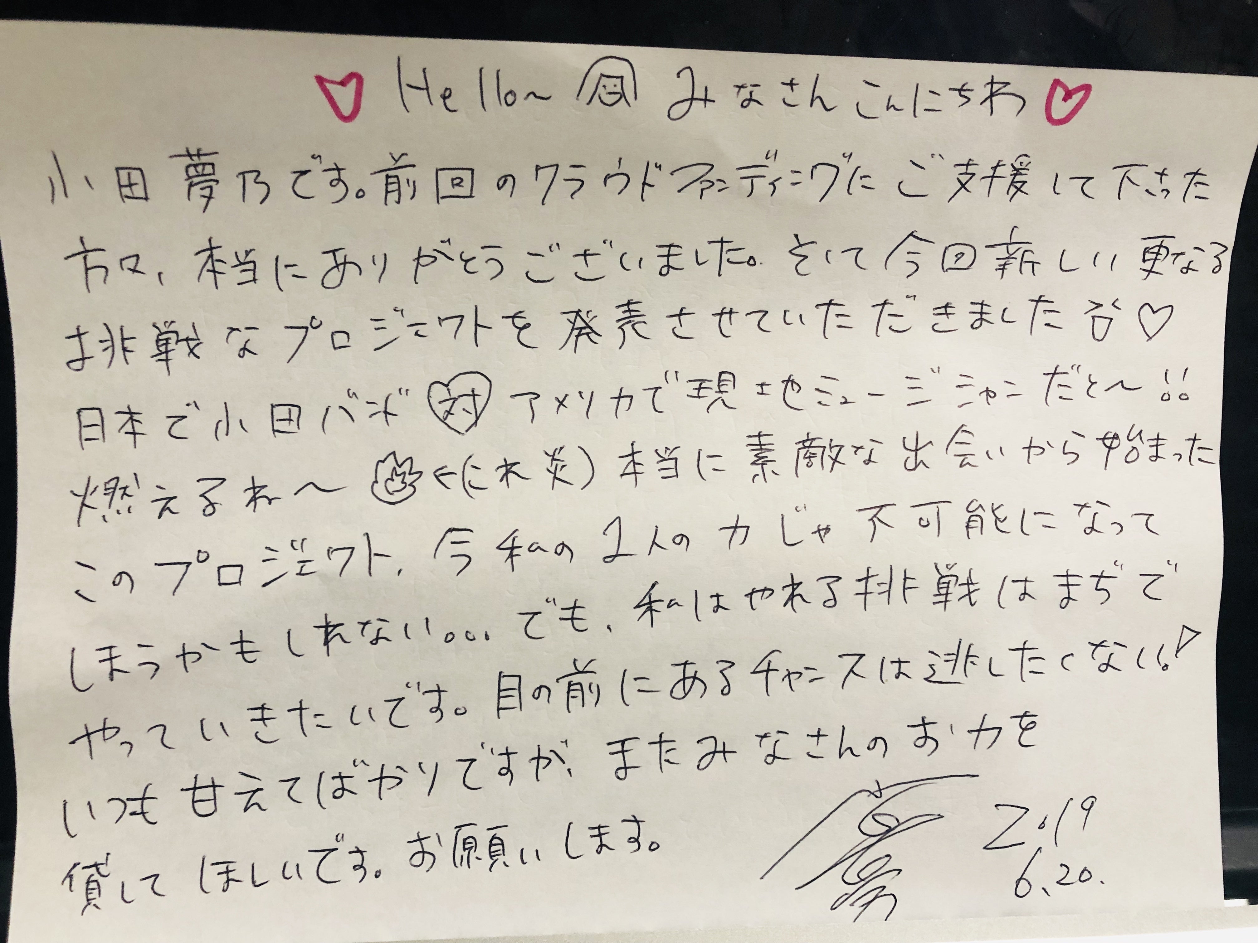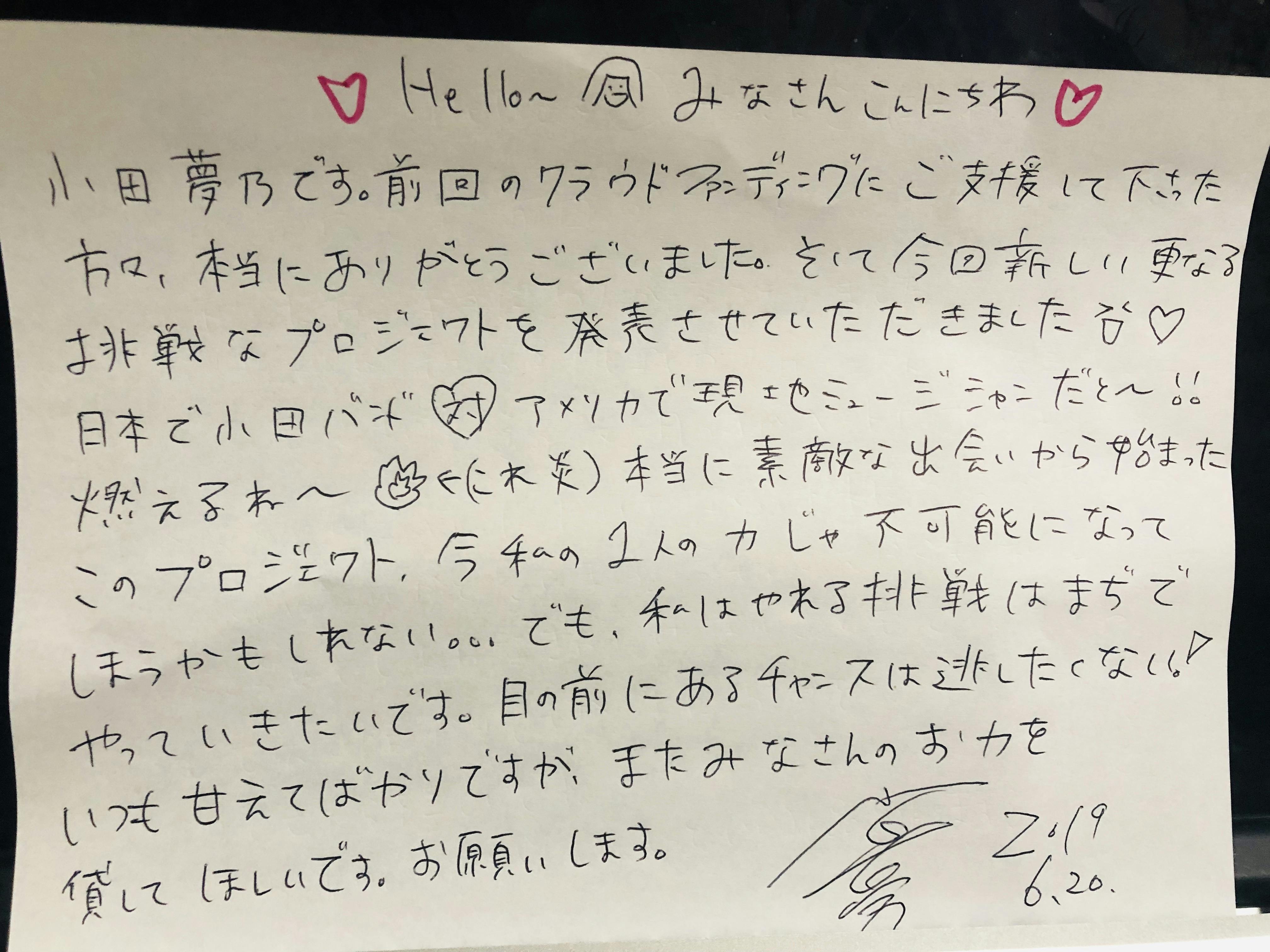 ただ実現するには様々な資金が必要になってきます。これからの小田夢乃の更なる活動に向けて皆さんに協力していただきたいと思い、このプロジェクトを立ち上げました。