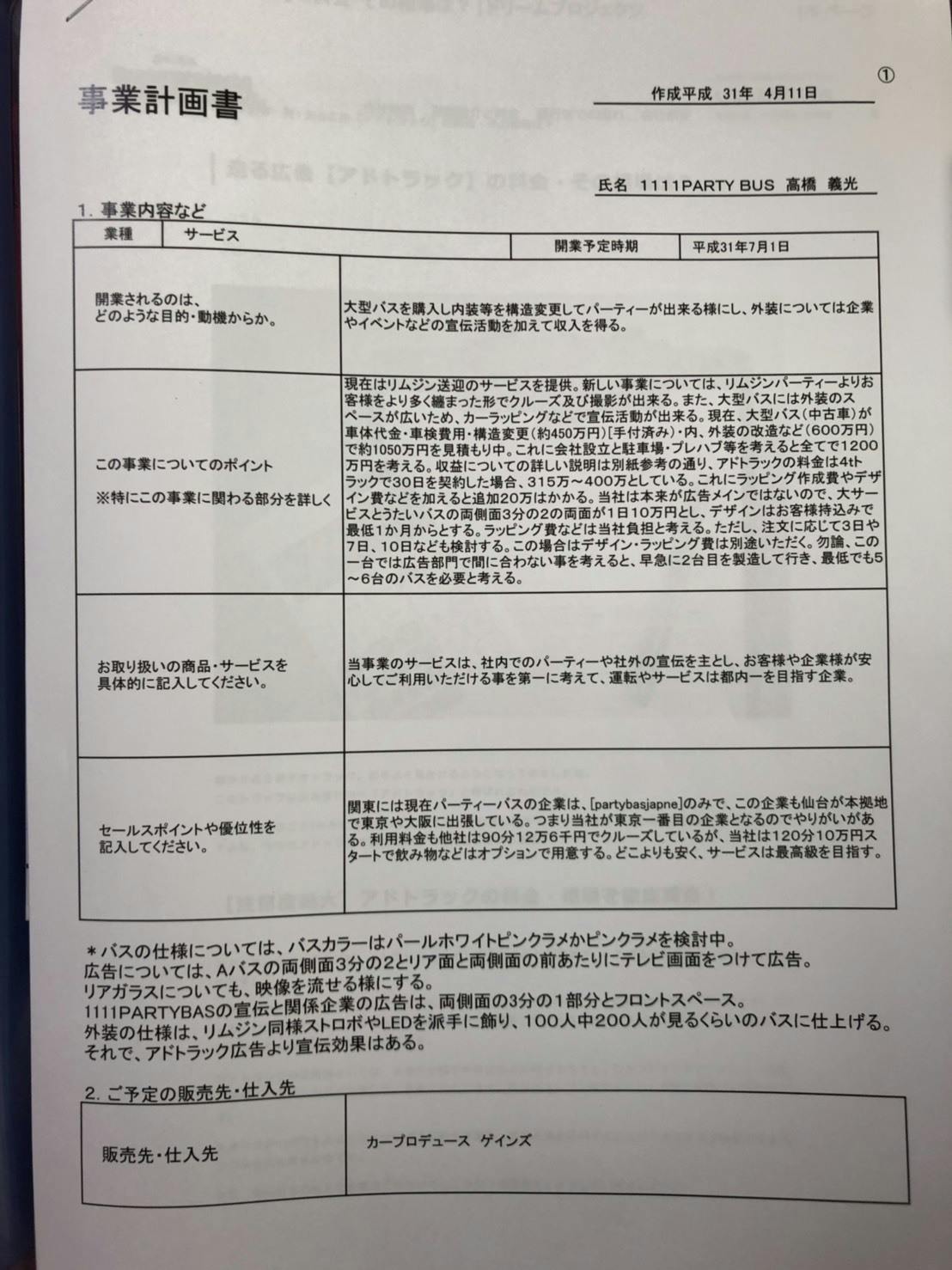 私たちは現在、リムジンクルーズの事業を展開しており、これからは海外で主流のパーティーバスが当たると考え立ち上げようとしています。