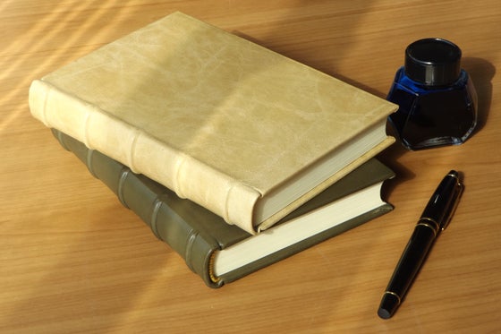 中身と表紙の厚紙が麻紐でつながった状態で製本するもので、いわゆるルリユールと呼ばれる製本です。表紙には革、マーブル紙などが用いられます。少し開きが硬いですが独特の雰囲気が魅力的です。
