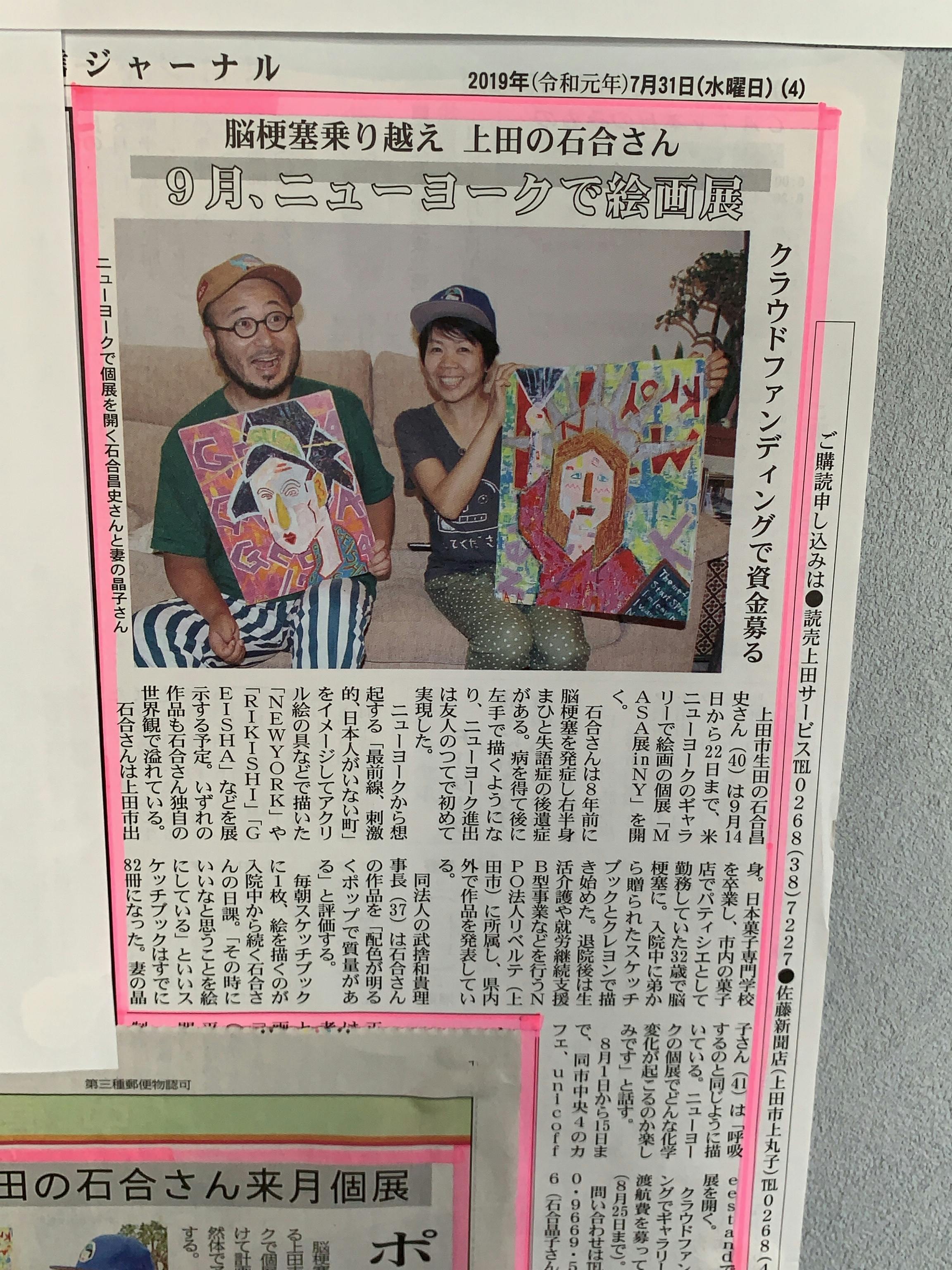 先日取材を受けた東信ジャーナルの7/31号に「MASA個展 in NY」とクラウドファンディングについて掲載されました。楽しい取材でした。東信ジャーナルさんありがとうございました。