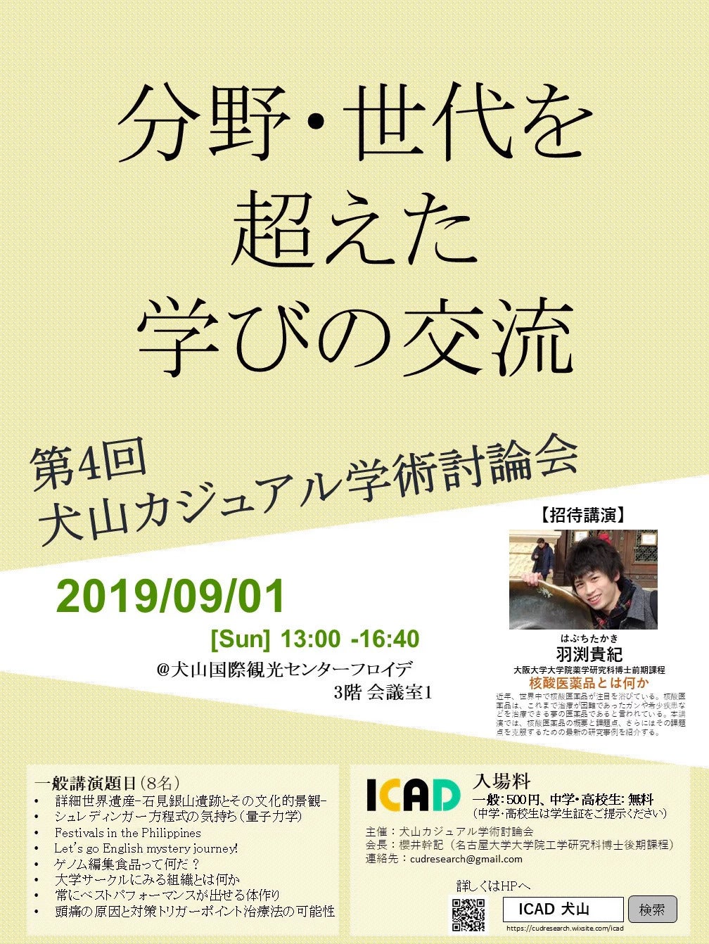 このようにICADは、様々な分野に対する討論を行ってきました。さらには、第3回目のICADでは犬山市と犬山市教育委員会からの後援をいただきました。現在、次回の2019年9月1日(日)開催の第4回ICADに向けて準備中です!
