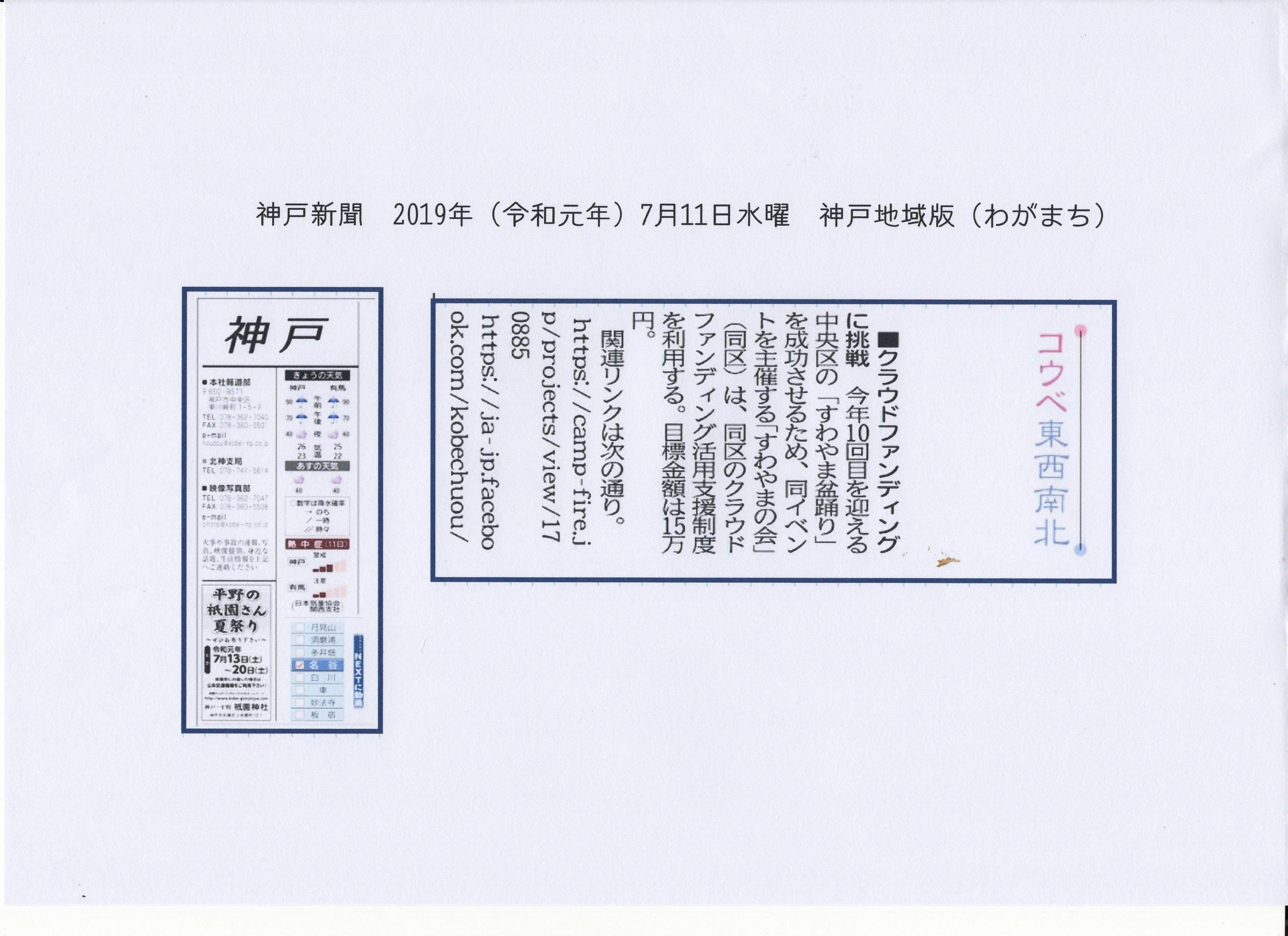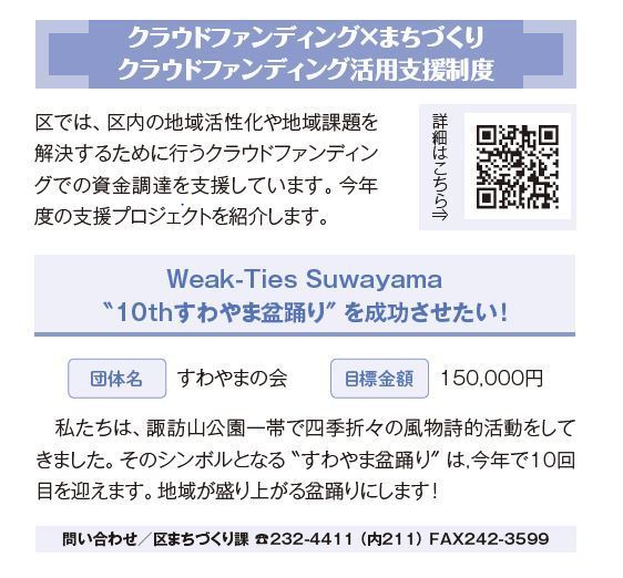 2019/07/25 19:0110thすわやま盆踊りクラウドファンディング,成功させたい! 神戸市中央区広報紙に,掲載されました! 歩みは今一つですが,後半頑張ります!皆様の一層のご支援をお願いいたします. もっと見る