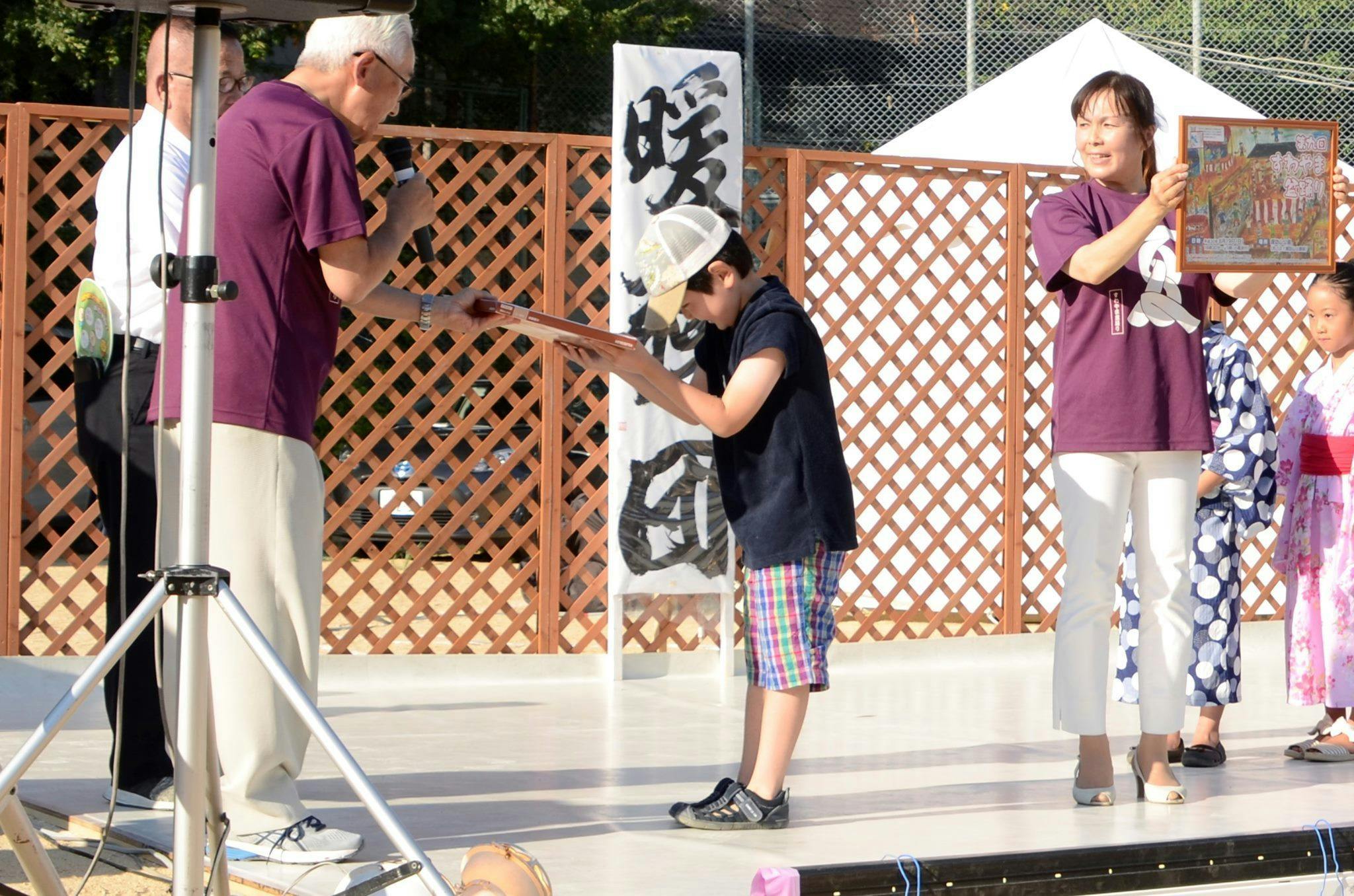 16時から始まる「ポスター表彰式」は、盆踊りポスター原画を「こうべ小学校」、「山の手小学校」の児童から募っておりその優秀作品をポスターにして表彰しています。