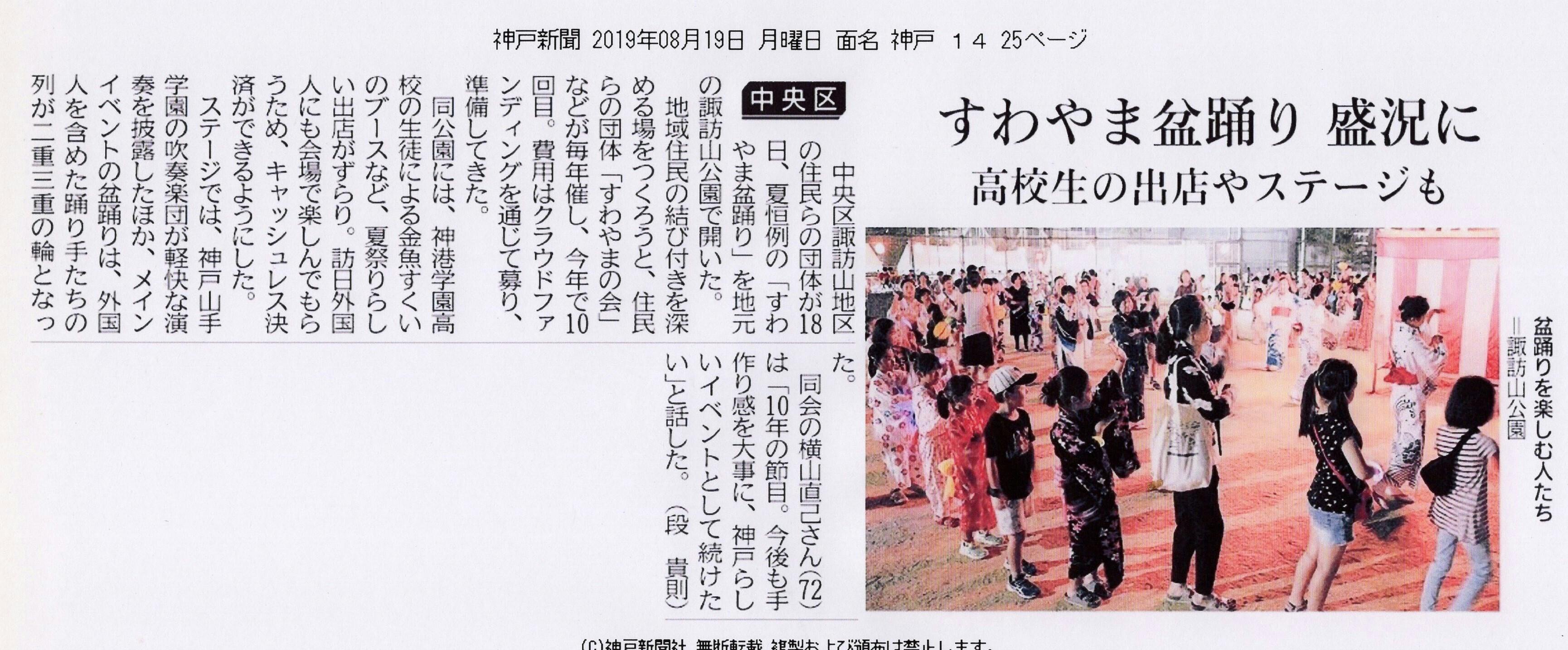 2019/09/03 18:388月18日 日曜日 夕刻,連日の天候不順ながらも当日は素晴らしい天気に恵まれ,無事に”10thすわやま盆踊”が開催できました. 開始時刻の16時頃には日差しの強さゆえか人出は今一つでしたが,夕暮れ時,ちょうど”神戸山手学園吹奏団”の演奏が始まる頃から急激な来場者がありました.おおよそ2,000人を超える方々が参加していただきました. クラウドファンディングでは,金額的には目標には届きはしなかったものゝ,たくさんの方々に,私たちの活動を伝えることができ,そして理解願ったことがとても大きな収穫でした. 私たちが活動してる地域での”風物詩的活動”には,日常性であるがゆえに”お金(出資)を出す”ことに馴染まない雰囲気(誰かが出すのでしょう!)が依然として残っています.この辺りを,クラウドファンディンの強みである,”ネットワーク”と”コミュニティー”を生かした戦略を,更にブラッシュアップして今後も挑戦していきたいと思っています. 今回は様々お世話になりました,深く感謝申し上げます.これからも,Weak-Ties Suwayama よろしくお願い申し上げます. もっと見る神戸市中央区広報紙に掲載されました!