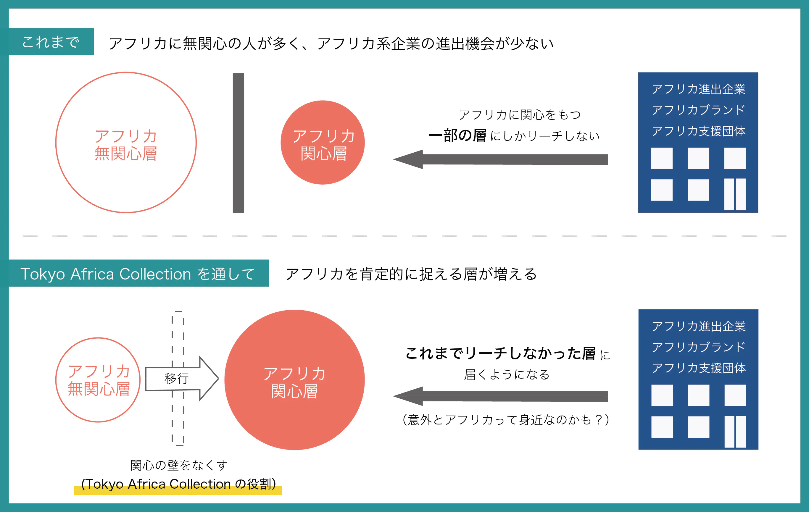 お客様の観点から言えば、無関心層に興味を持ってもらったその先にある「アフリカの良いもの」がより身近なり、最初のステップ(関心を持つ)から次のステップ(アフリカの良いものを買ってみる・アフリカへ行ってみる)へ足を延ばしやすくなります。