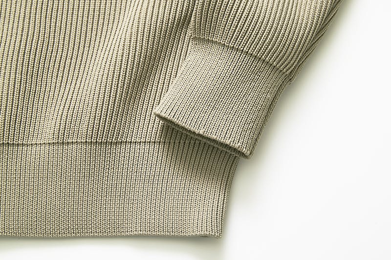 「匠」曰く、この編み機の特徴は、「畦編みを編み上げると、とにかく編み目が美しい」と、その編機にほれ込み、更に研究と編機の調整を重ねて限界まで目を詰めていった編み目は、英国製のようなハリ・コシぎっしりしたセーターを完成させました。