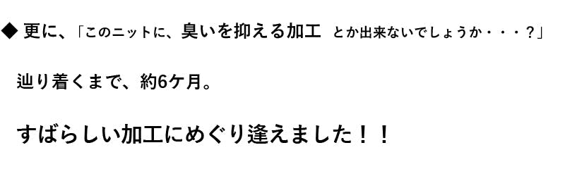 今回の商品は、周りの声をヒントに、約8ヶ月間試行錯誤し、糸商様、ニット工場様、加工工場様、また、撮影に関わって頂いた方、グラフィックデザイナー様、たくさんの方々に支えられて私達のアイデアが具現化することが出来ました。この場をお借りしてお礼申し上げます。
