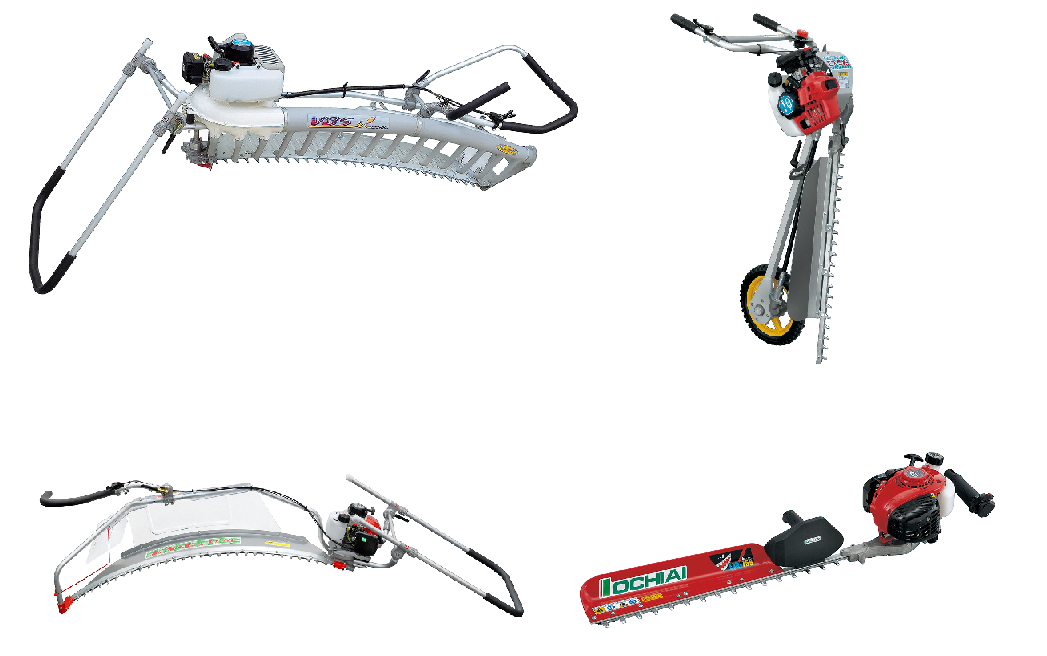 ・農機具類。右上から時計回りに「裾刈り機」・「エンジントリマー」・「刈ナラシ機」・「茶摘み機」