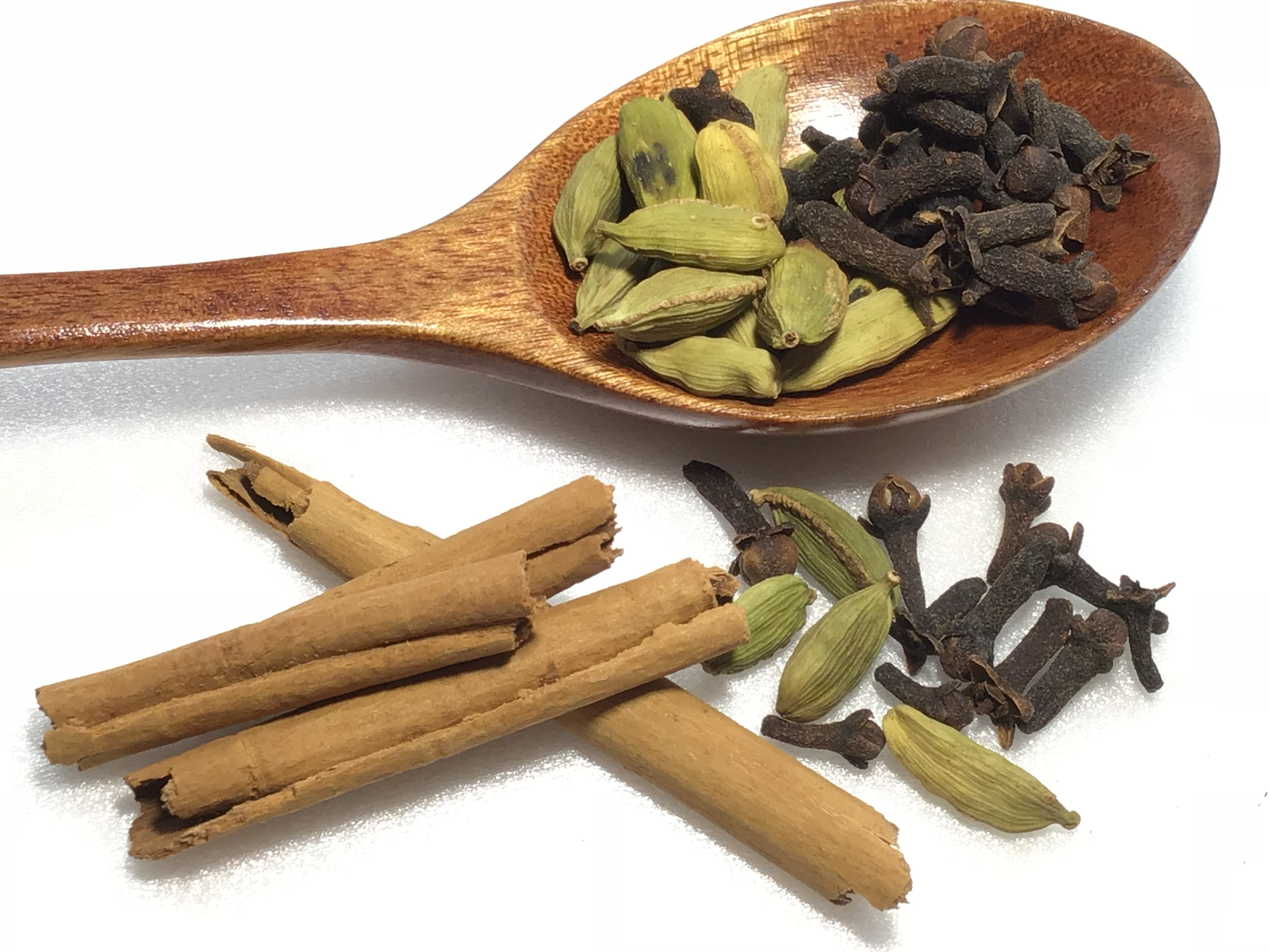 ・シナモン(茶色)、カルダモン(緑色)、クローブ(濃い褐色)