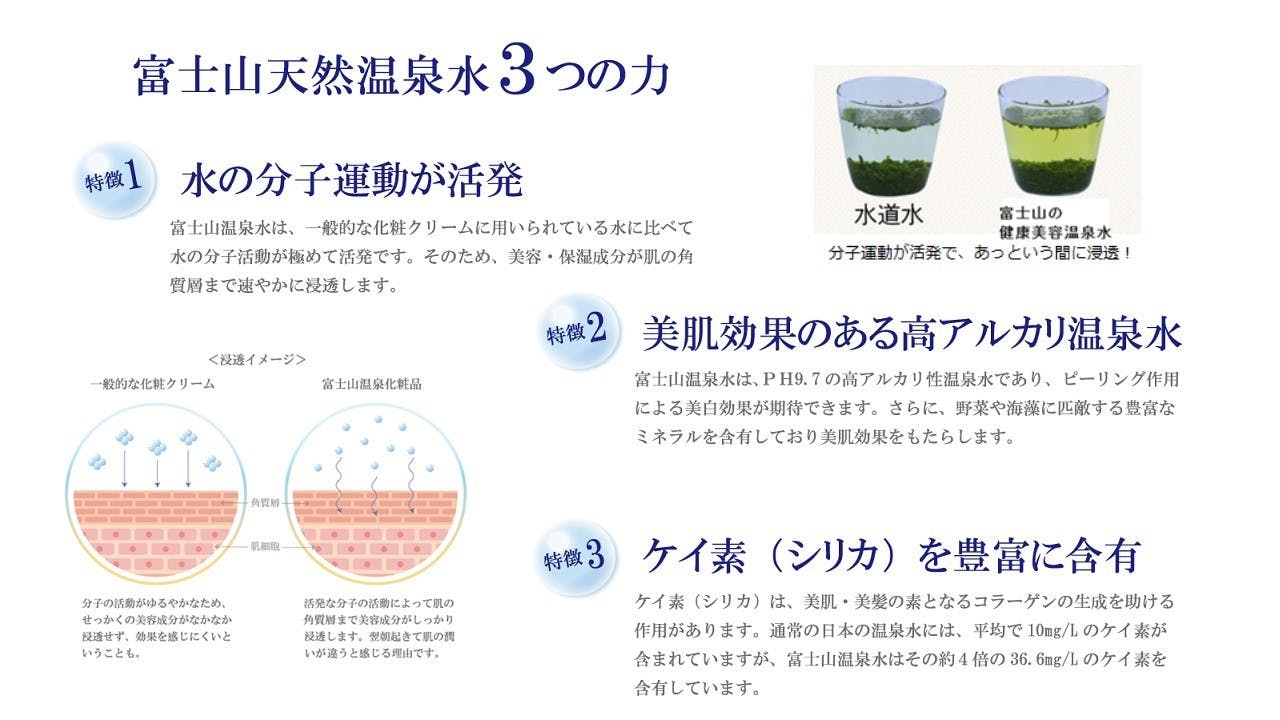 温泉水には、コラーゲン生成や肌細胞の活性効果のあるケイ素が36.6mg/L(日本のミネラルウォーター平均の約4倍)を含有し、PH9.7の高アルカリは、古い角質を落とし美白効果も!また、地底1500mで富士山の溶岩に無酸素状態で密閉されていた富士山温泉水は、粒子が細かく浸透力に優れています。