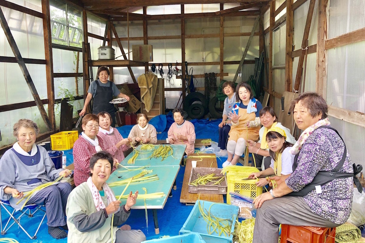 乗鞍高原の在住の女将さんなどのグループ 乗鞍うまいもの工房 ふきの下処理作業風景