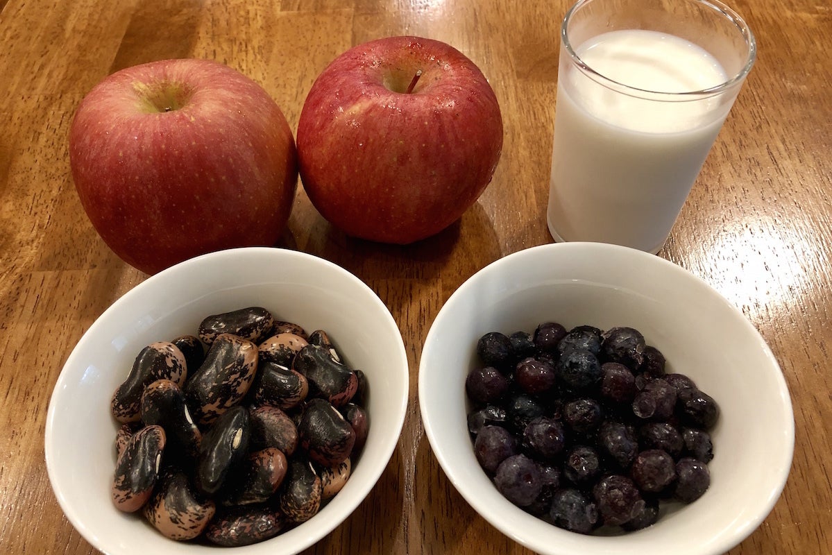 乗鞍の恵み 左下:花豆 右下:ブルーベリー 左上:りんご 右上:ヤギミルク