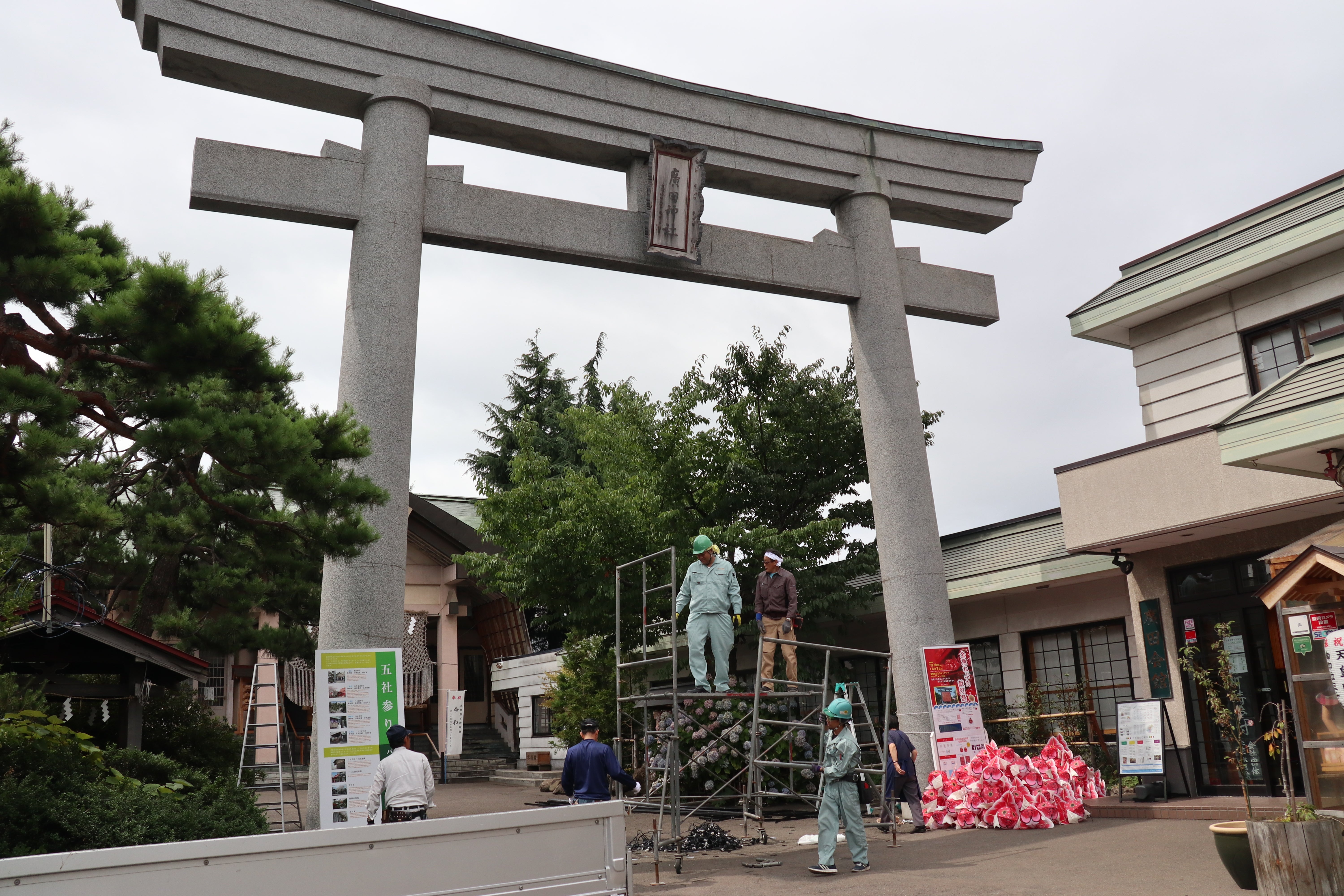 廣田神社の大鳥居は青森市では一番の高さを誇り、和紙で出来た金魚ねぶたでも落下すると危険なため、風に吹かれても飛ばされないよう強固な鉄骨の柱が必要になります。