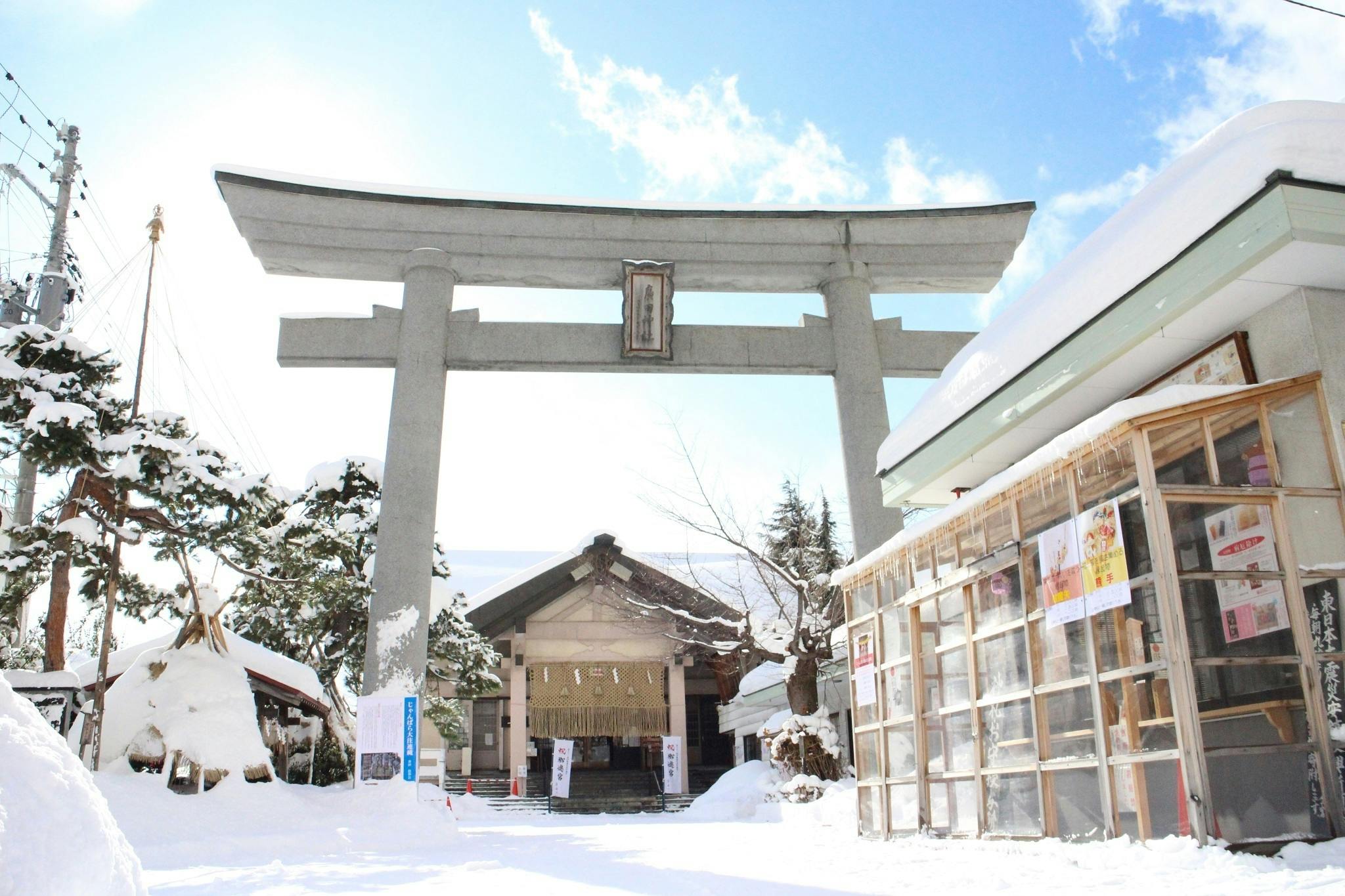 青森市の国道4号線を通るとひと際目立つこの大鳥居は、昭和の大空襲で灰燼に帰した際、都市計画で表参道が市道に変更させられ、余儀なく移動させられた鳥居を再建したものでした。