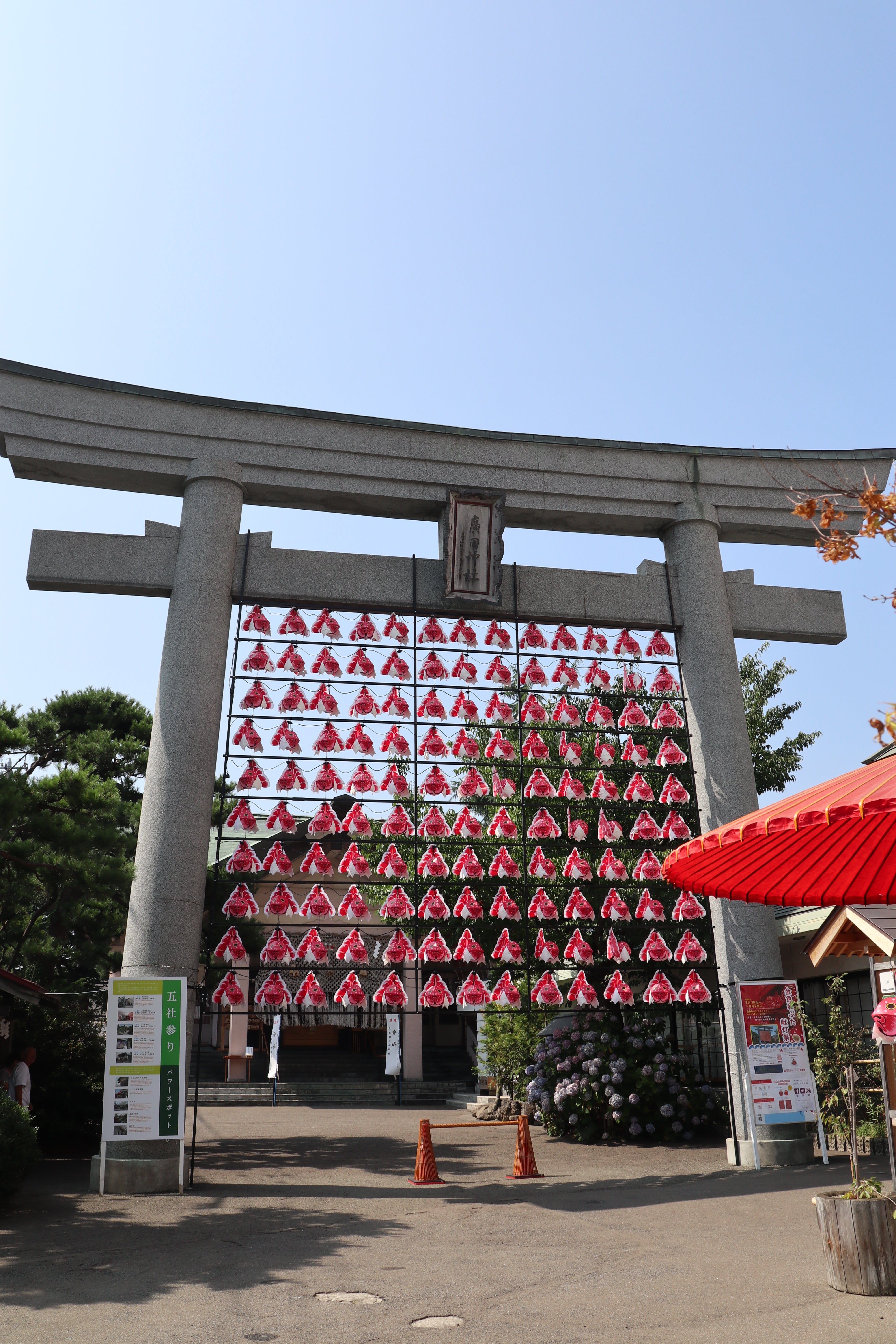 7月30日から8月7日まで点灯された金魚ねぶたも、青森ねぶた祭と共に無事終了しました。撤去作業の関係で9日まで掲げていましたが、10日に鳥居より下ろして役目を終えた金魚ねぶたは帰って行きました。130個の金魚ねぶたも、下げるときはあっという間で、午前中で全て取り外されました。献灯された風景に見慣れてしまっていたので、鳥居だけになると境内がとても広く感じ、不思議な感じでした。それも徐々にまた日常に戻っていきますが、来年の夏、再び皆様をお迎えして幸せを運ぶのを楽しみにしております。本当に皆様、誠にありがとうございました。