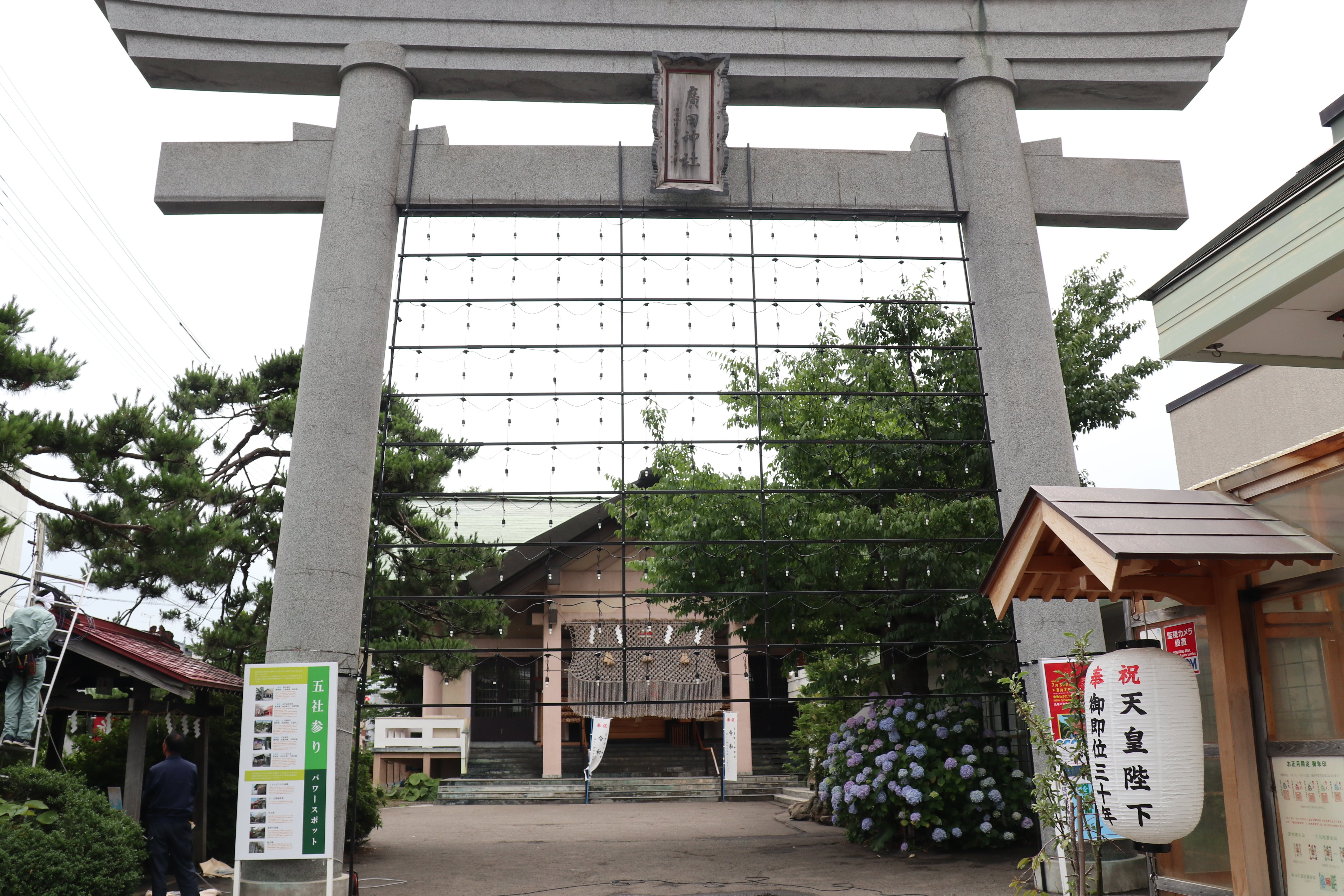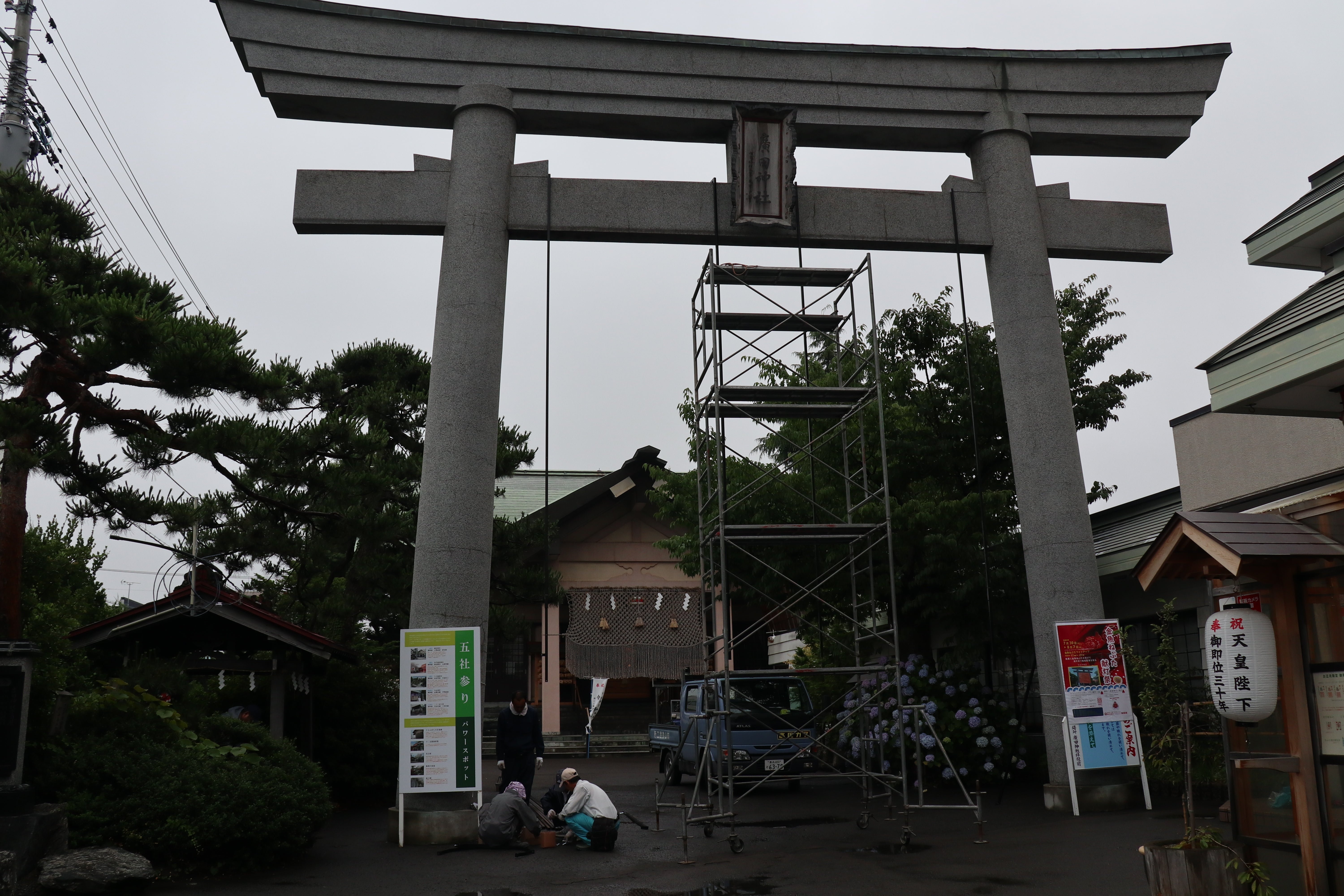 献灯祭に掲げられる金魚ねぶたが風で飛ばされないようにするため、鉄骨の枠を設置して固定する予定です。その鉄骨の枠並びに電球が完成したということで、一度試しに大鳥居へ取り付けてみました!作業はいつもお世話になっている逢坂建築設計事務所の皆さん(^^)少しずつ場所や寸法を微調整しながら取り付けています。そこはさすがの職人さん方、あっという間に外郭が出来てきました!!さらに横の鉄骨が取り付けられると、ぐっと献灯されたイメージが湧いてきました♬7月30日の献灯祭に合わせて万全の作業で取り組みます!本日(19日)は神社が休務日となっておりますが、参拝は可能です。くれぐれも作業にご注意いただきましたご参拝ください。