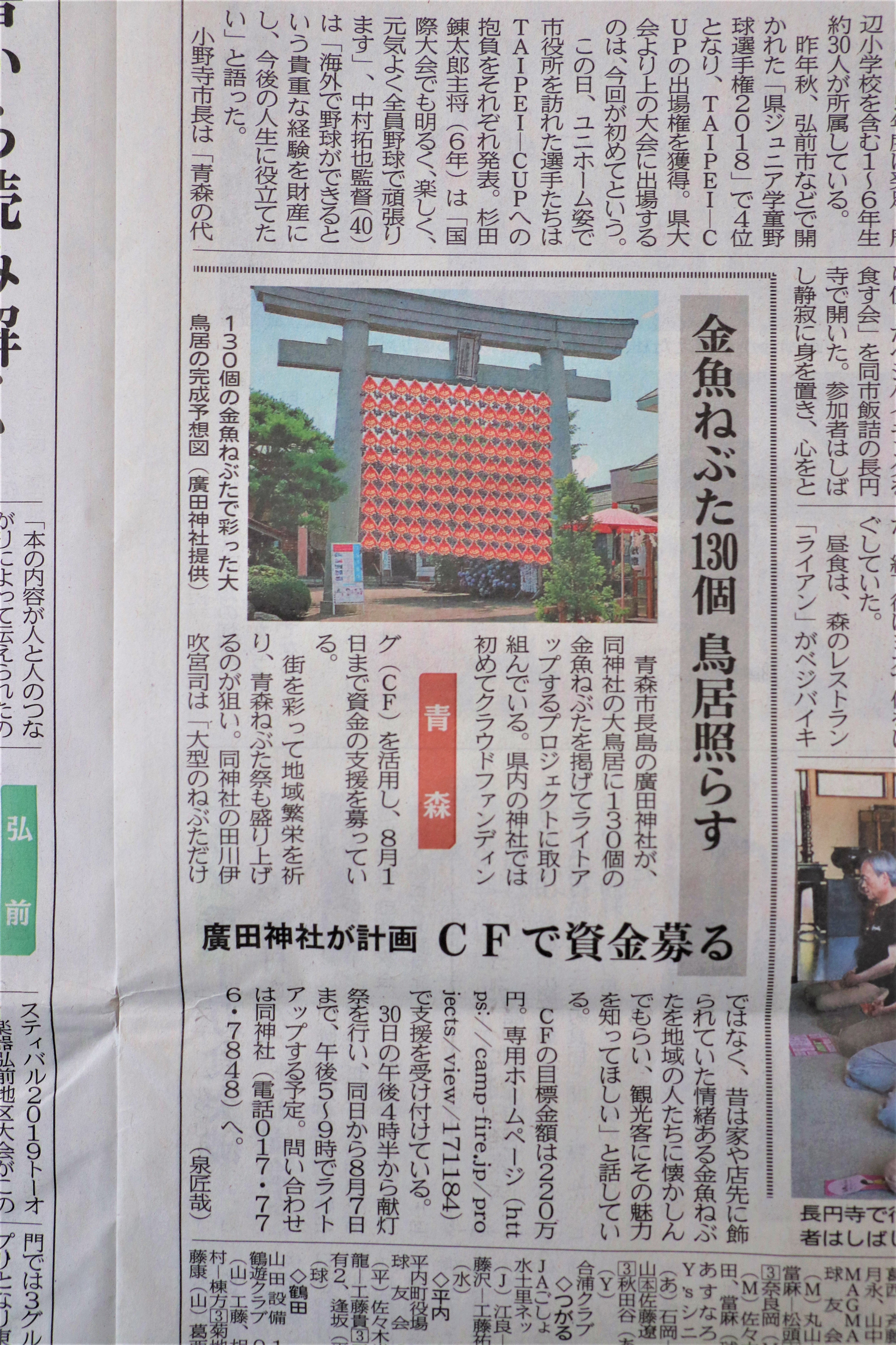 本日発売の東奥日報朝刊に、金魚ねぶた献灯祭のプロジェクトが紹介されました^ ^カラーページでイメージ図と共に地域紙面に大きく掲載♫青森県の神社では初となるクラウドファンディングを使用しての祭事に注目していただきました!この祭事を通して、金魚ねぶたの魅力が広まっていただければと思います。クラウドファンディングで寄付の申し込みが難しい方は神社でも直接受付しておりますので、気軽にお声掛けください^ ^