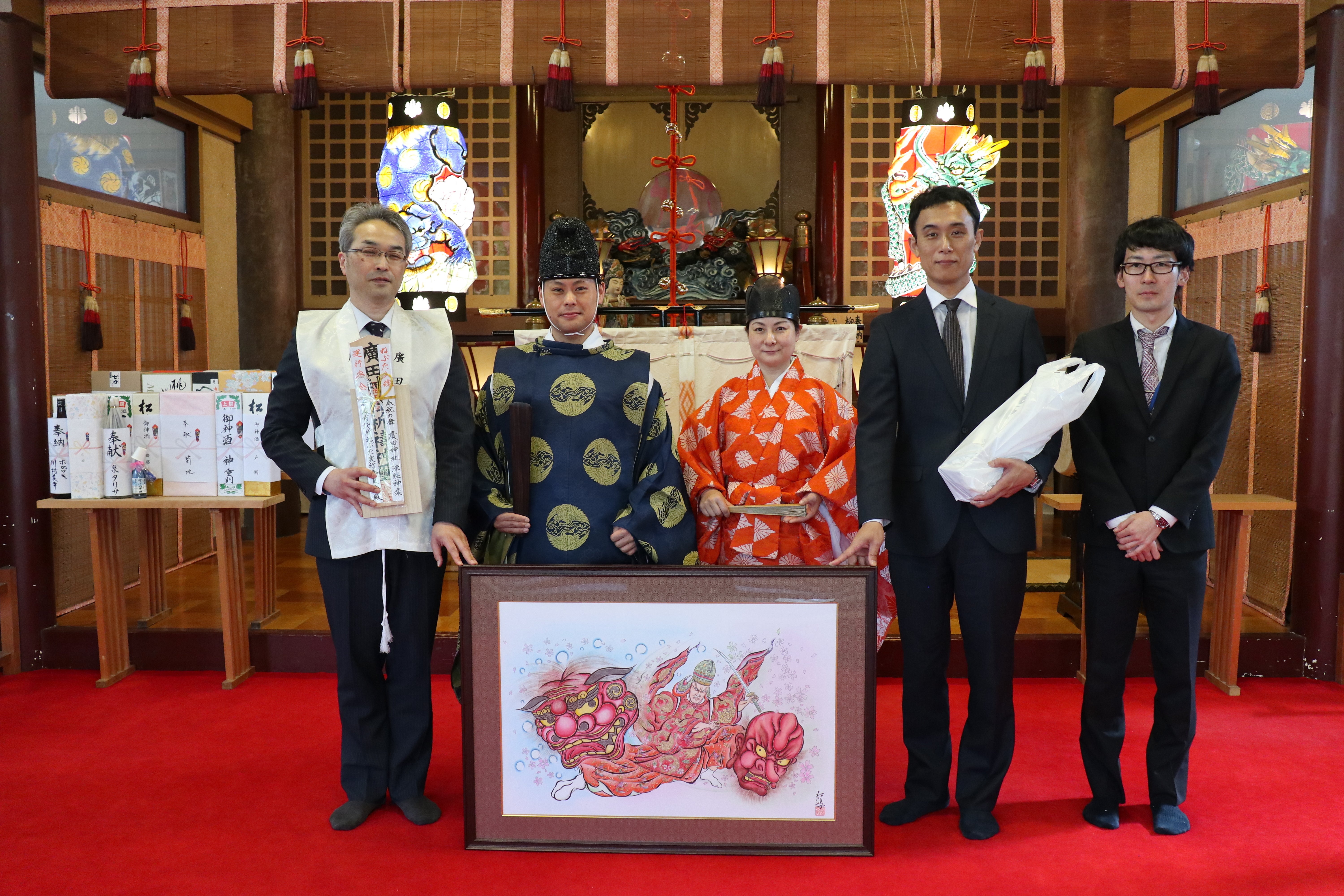 一足先にねぶた囃子が轟きました~!【囃子方 青森ねぶた 凱立会】さんの必勝並び祭安全祈願(^^)/会長をはじめ、各楽器の代表に玉串を奉りてご拝礼頂きました。毎年、神事終了後には奉納演奏をしてくださいますが、あまりの迫力に、参拝される皆さんも立ち止まって思わず聞き惚れていました。凱立会さんは日立連合ねぶた委員会さんの囃子方ですが、毎年団体の入魂祭とは別に、改めて会単独でも祈願しております。その囃子に掛ける姿勢は結果にも表れ、5年連続「囃子賞」受賞という快挙を達成しております。実際に生で聴くとよくわかりますが、一糸乱れぬ演奏に身震いするほどです!!青森ねぶた祭は、「ねぶた」そのものの迫力も勿論ですが、それを引き立たせる夜空まで轟かせる囃子の演奏も見どころです!ぜひ、凱立会さんをはじめ、各団体の囃子の違いも楽しんで見てください♪