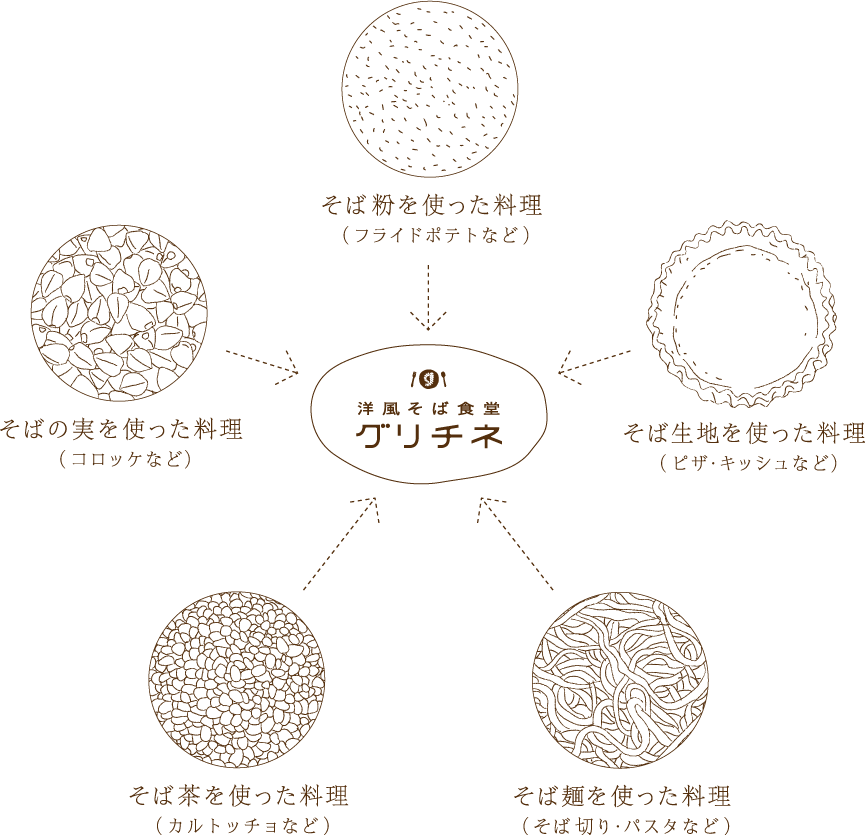 そこで、洋風そば食堂グリチネでは、日本伝統の本格手打ち蕎麦、そば粉、そばの生地、そばの実や芽、そば茶と蕎麦の活用方法を大きく5要素に分類し、食材が持つヘルシーで美味しいレシピを開発して来ました。