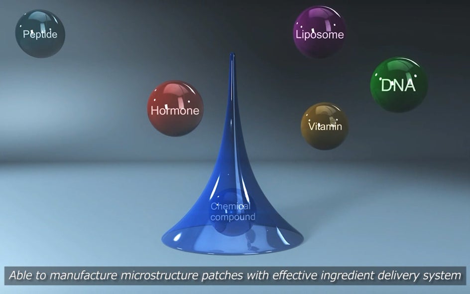 体内に入れたい薬物を主に髪の毛の4分の1の細さの「溶けるマイクロニードル」につくり上げてパッチタイプにして簡単に効率良く安全に薬物を投与できるように実現しました。