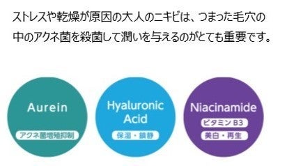 ニキビの原因はアクネ菌です。アクネ菌は乾燥したお肌、あるいはべたついたテカリのあるお肌に住み着きやすく、このアクネ菌が増殖するとニキビの原因であるアクネ菌を殺菌して炎症を抑えるナイアシンアミドが含まれております。