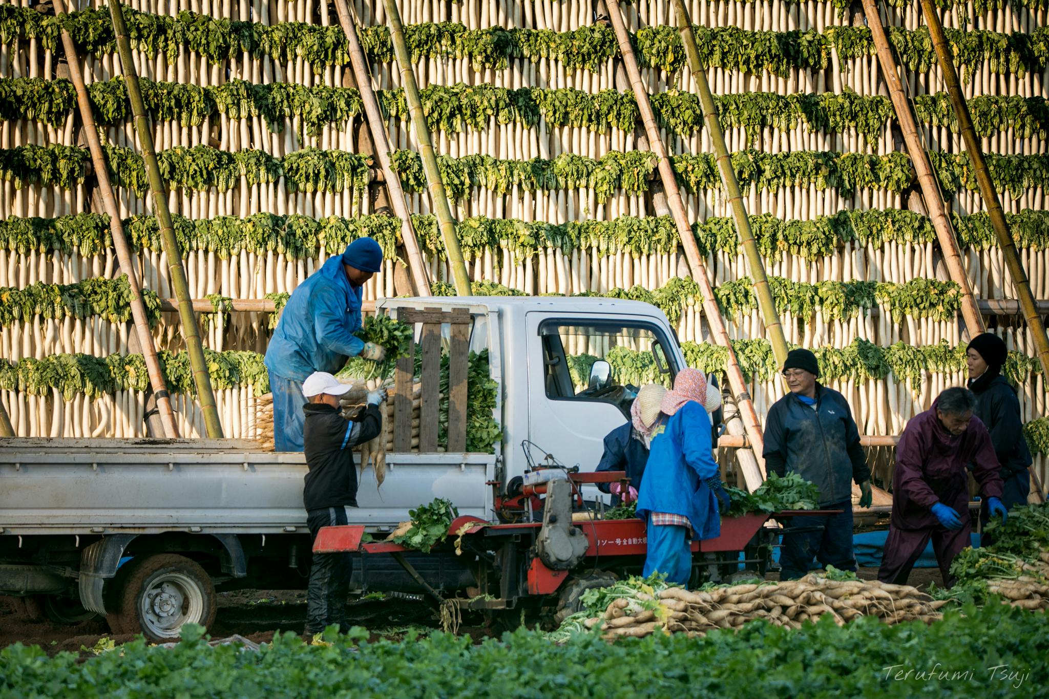 干しが終わった大根を収穫しトラックに荷積みしている様子