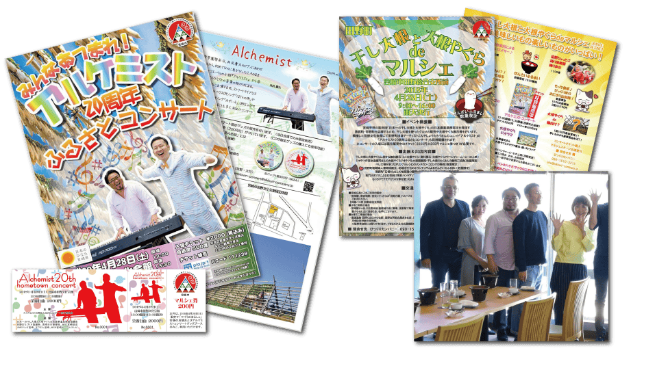 制作したポスター、チラシ、チケット。写真はコンサート前日の食事会での一コマ。