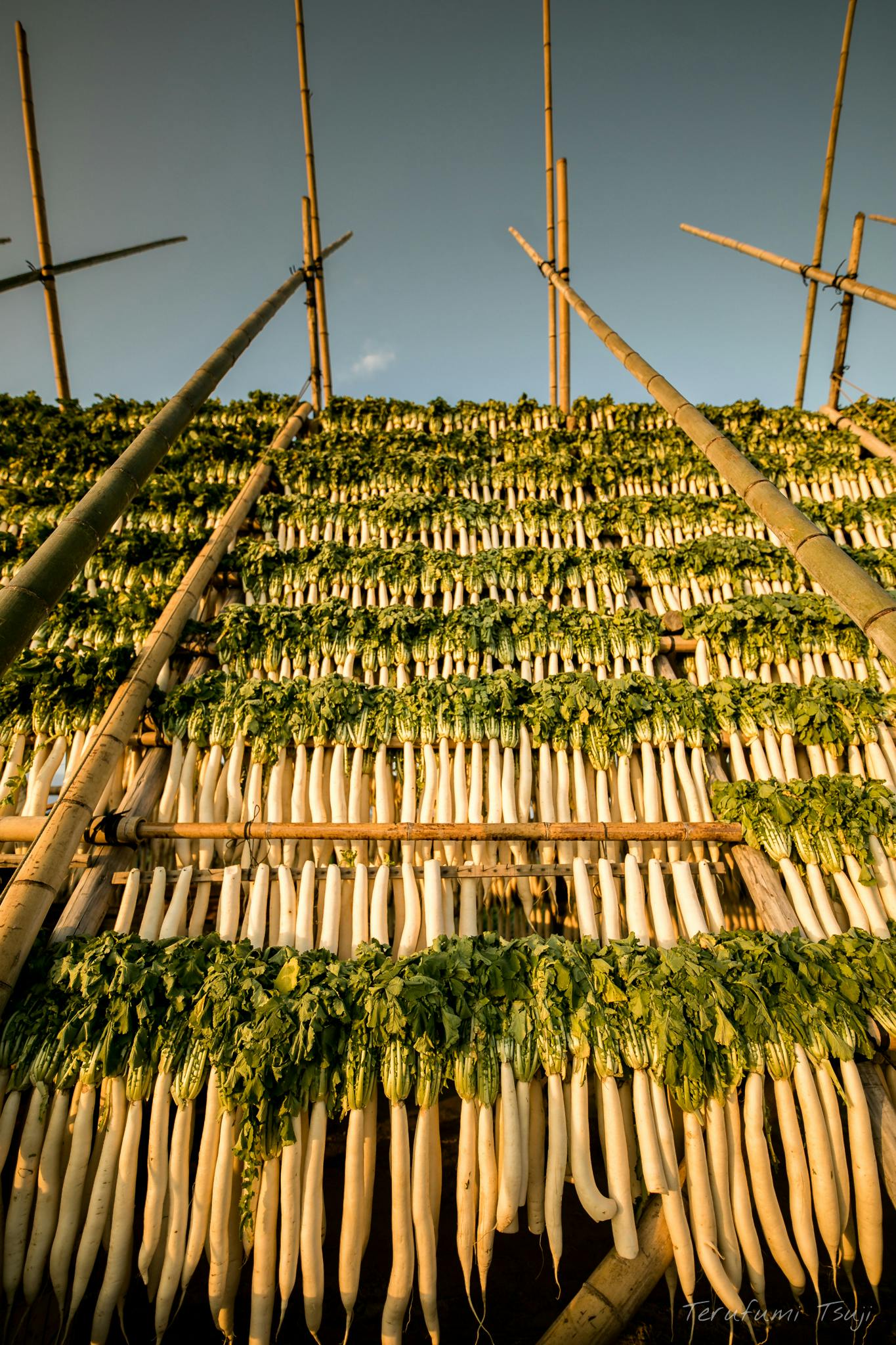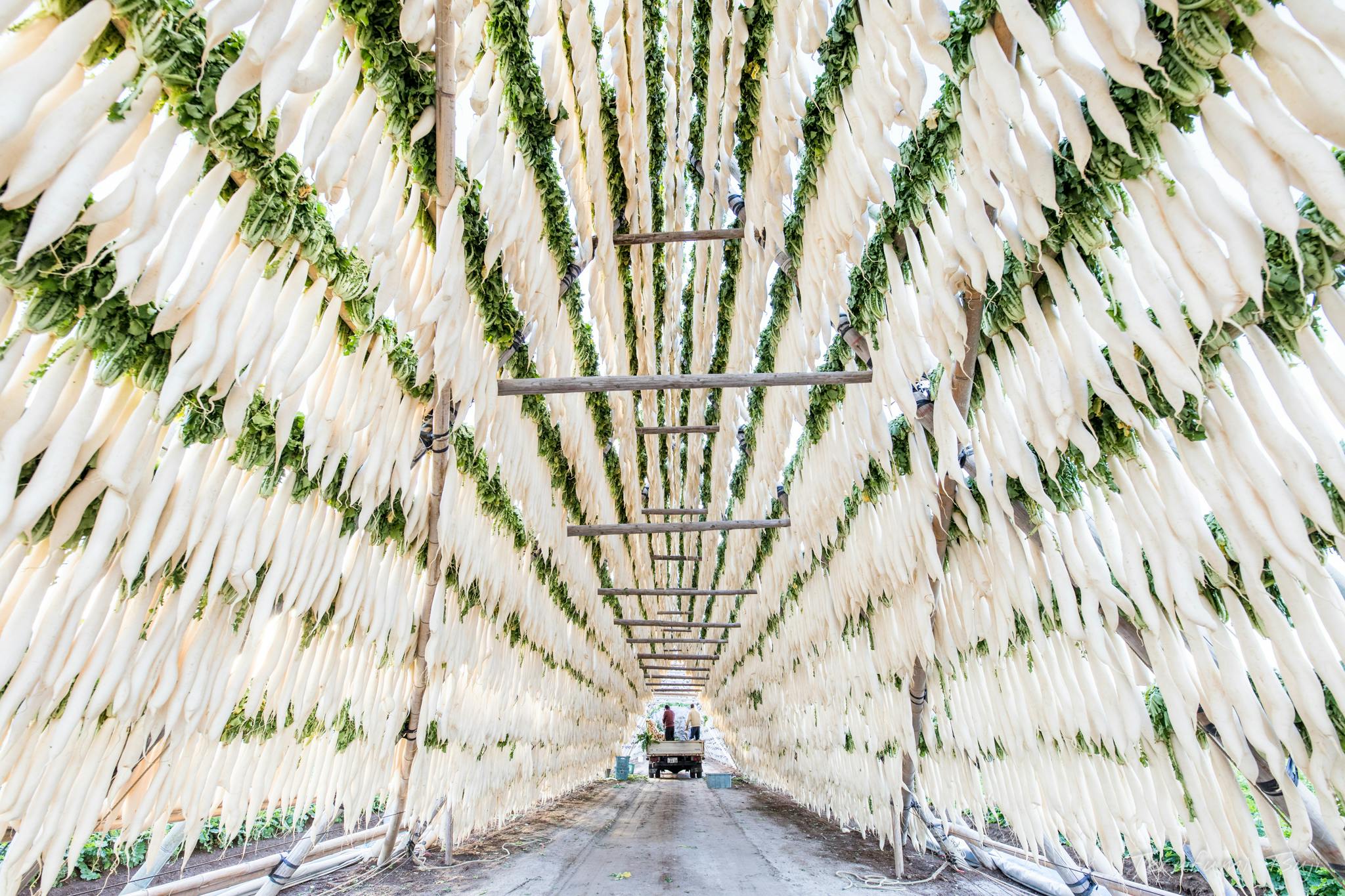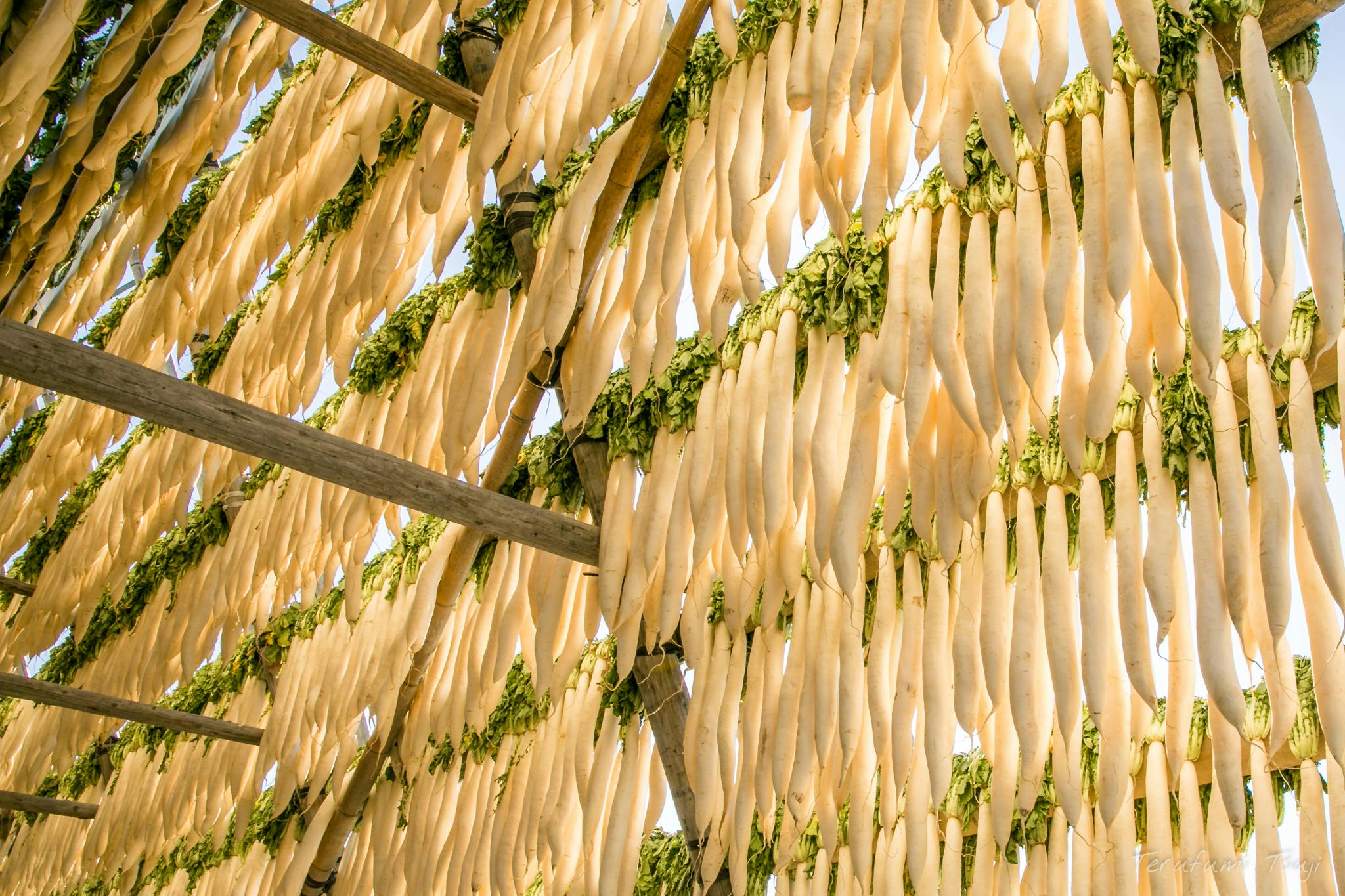 大根やぐらに適度な隙間を空けて干された大根