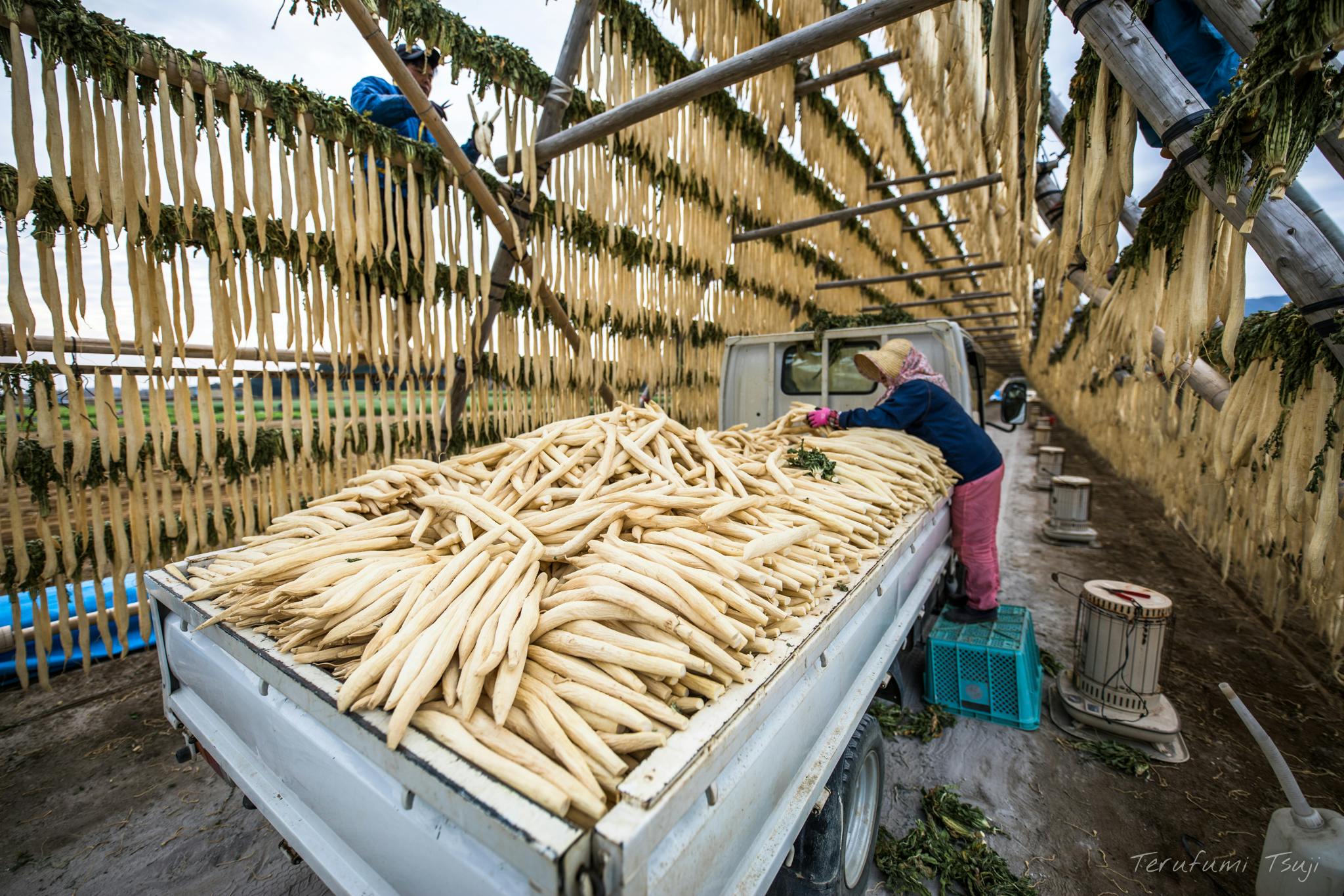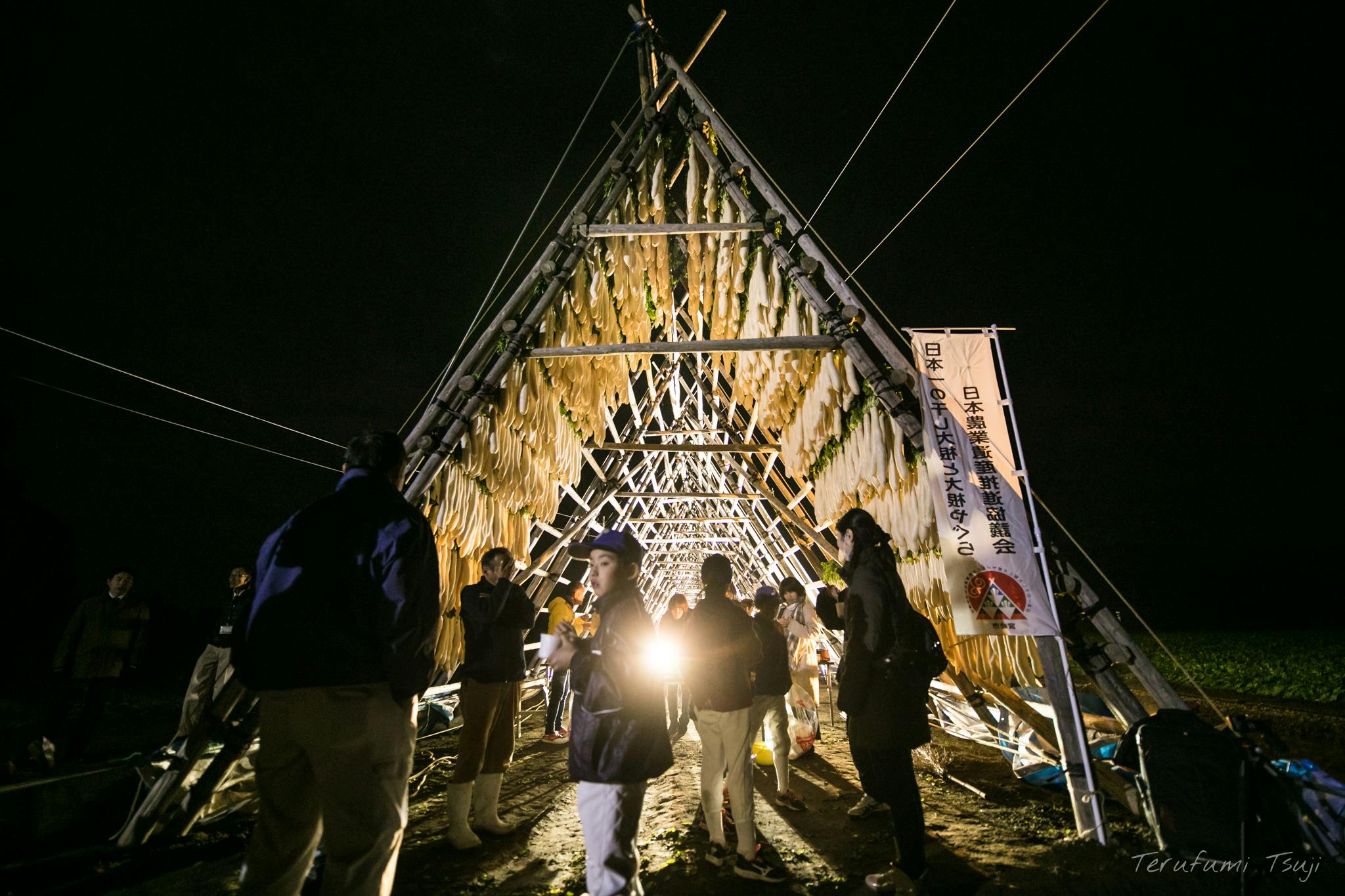 ブルーシートで覆われた大根やぐら降雨の時と気温が0度になるような時にやぐらをブルーシートで覆う。(雨が当たると菌が発生し大根が変色するため)気温が0度を下回る時は、やぐらの中でストーブなどの暖房を焚いて干し大根が凍るのを防ぐ。【大根が凍ると、品質の低下を招く。】高さ6m×幅6m×長さ50mのやぐらで、干し大根が約30a分の大根が干せます。