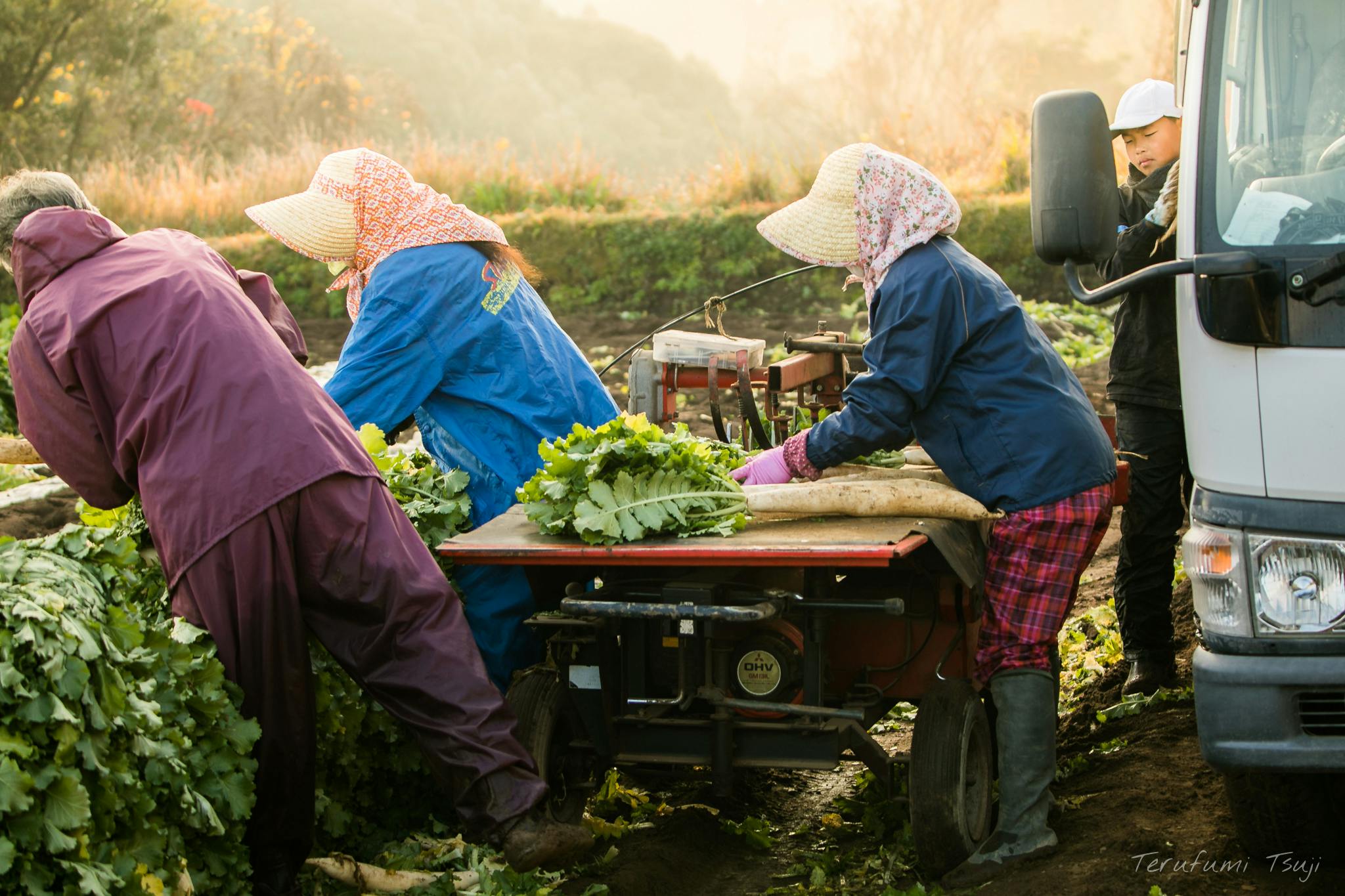 収穫した白首大根を2本一組で紐で縛って、トラックに荷積みする様子