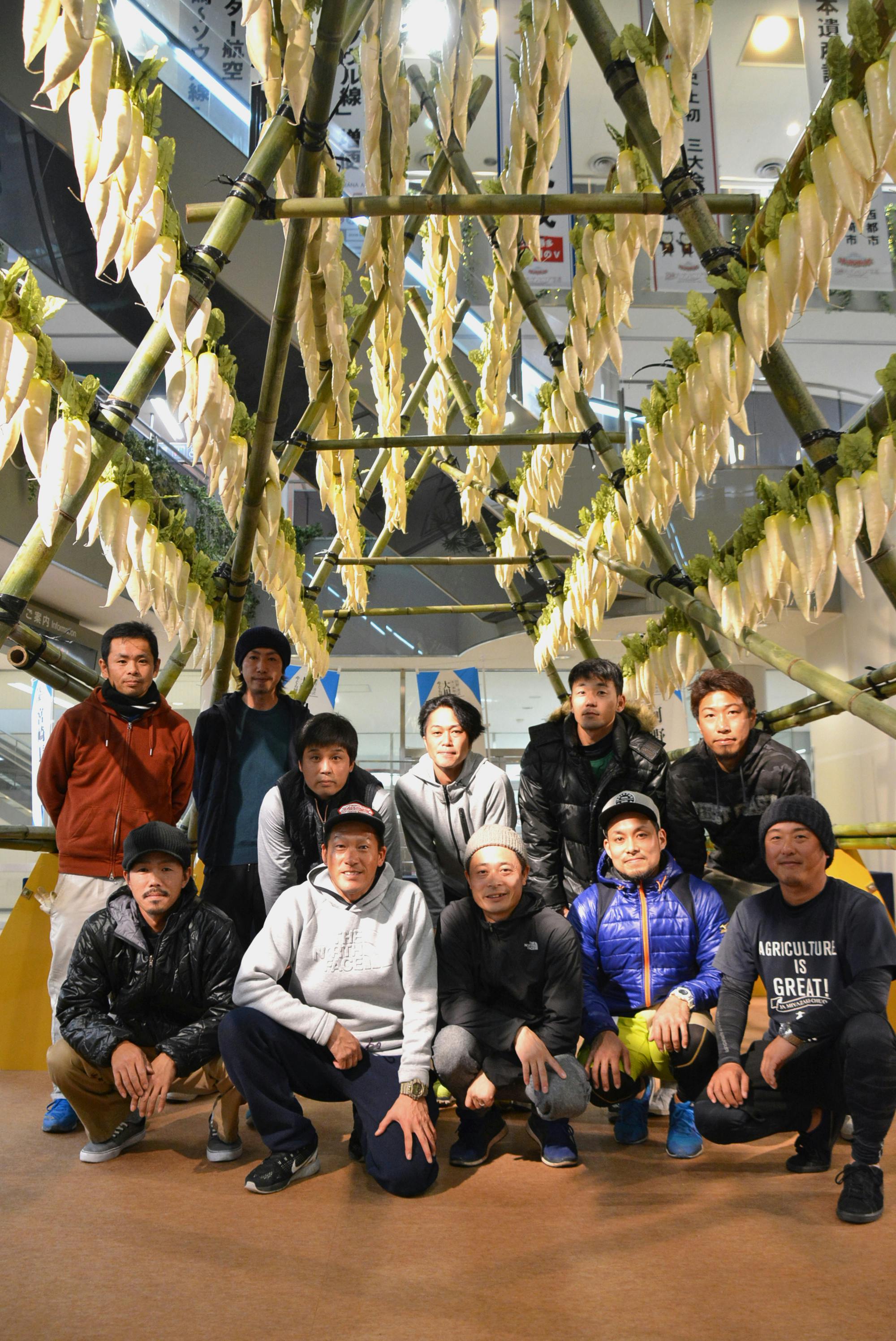 ブーゲンビリア空港(宮崎空港)で展示された大根やぐらを組み立てたメンバー