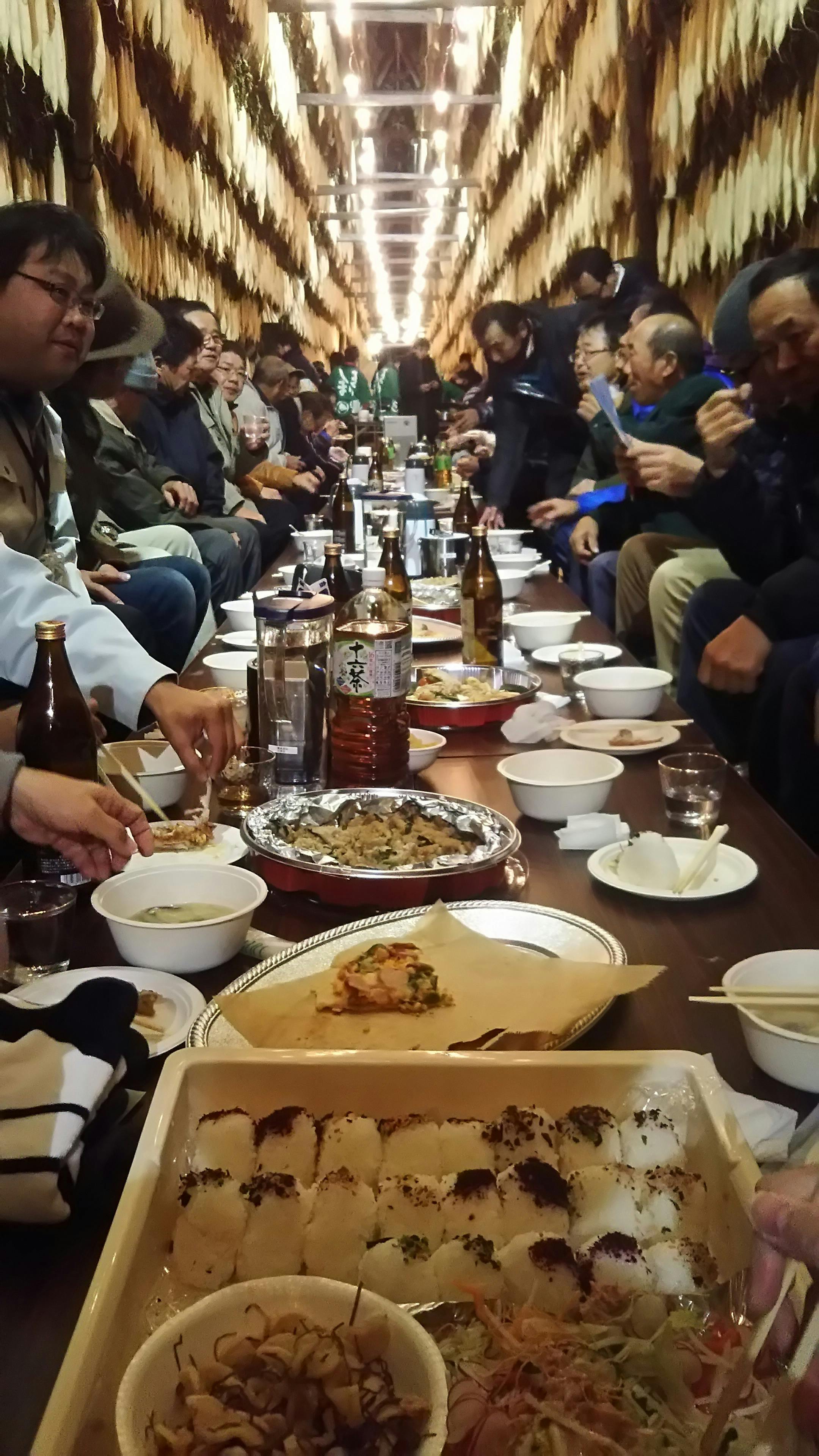 夜の大根やぐらの中で宴を楽しむ田野町の人々