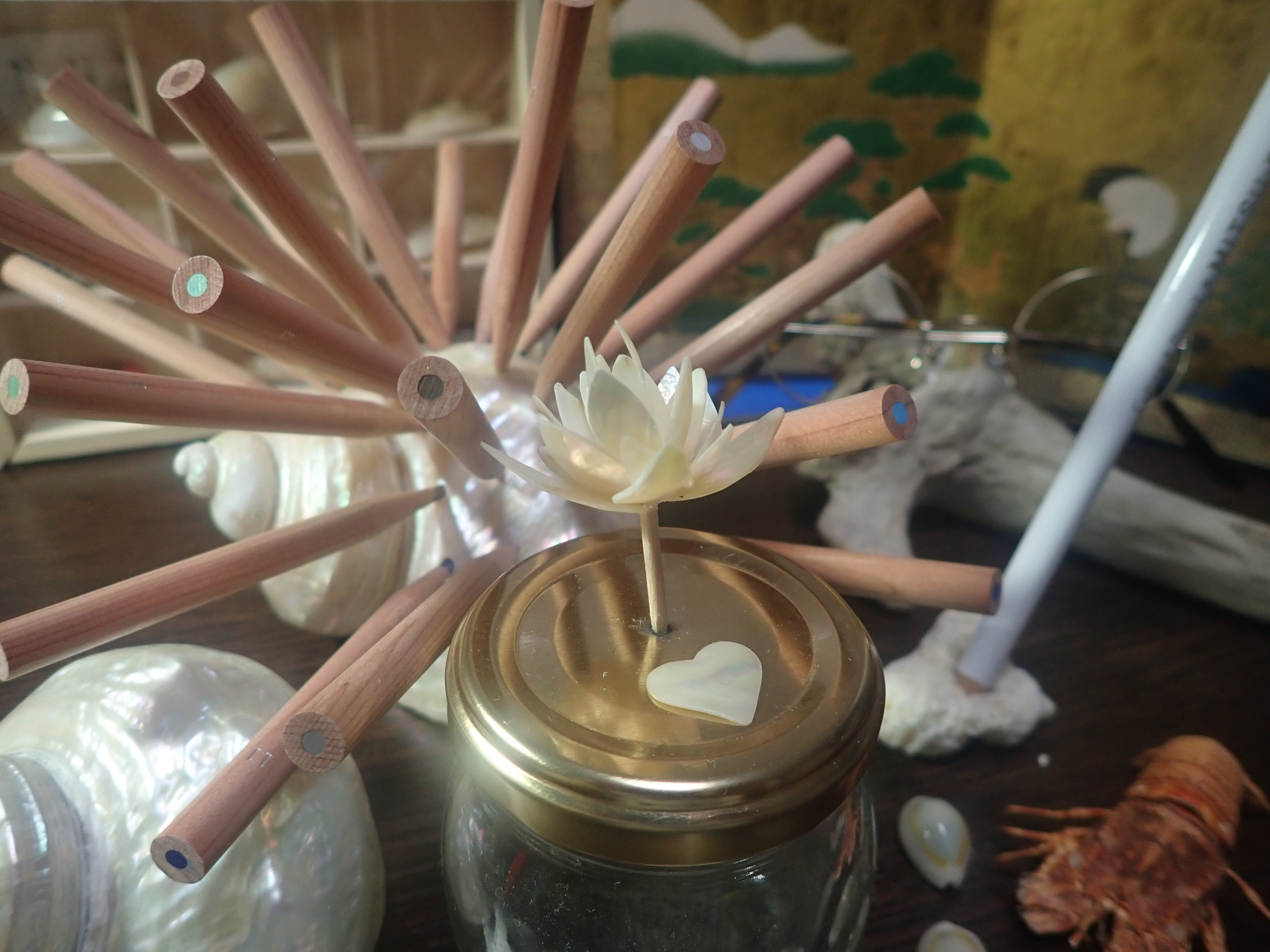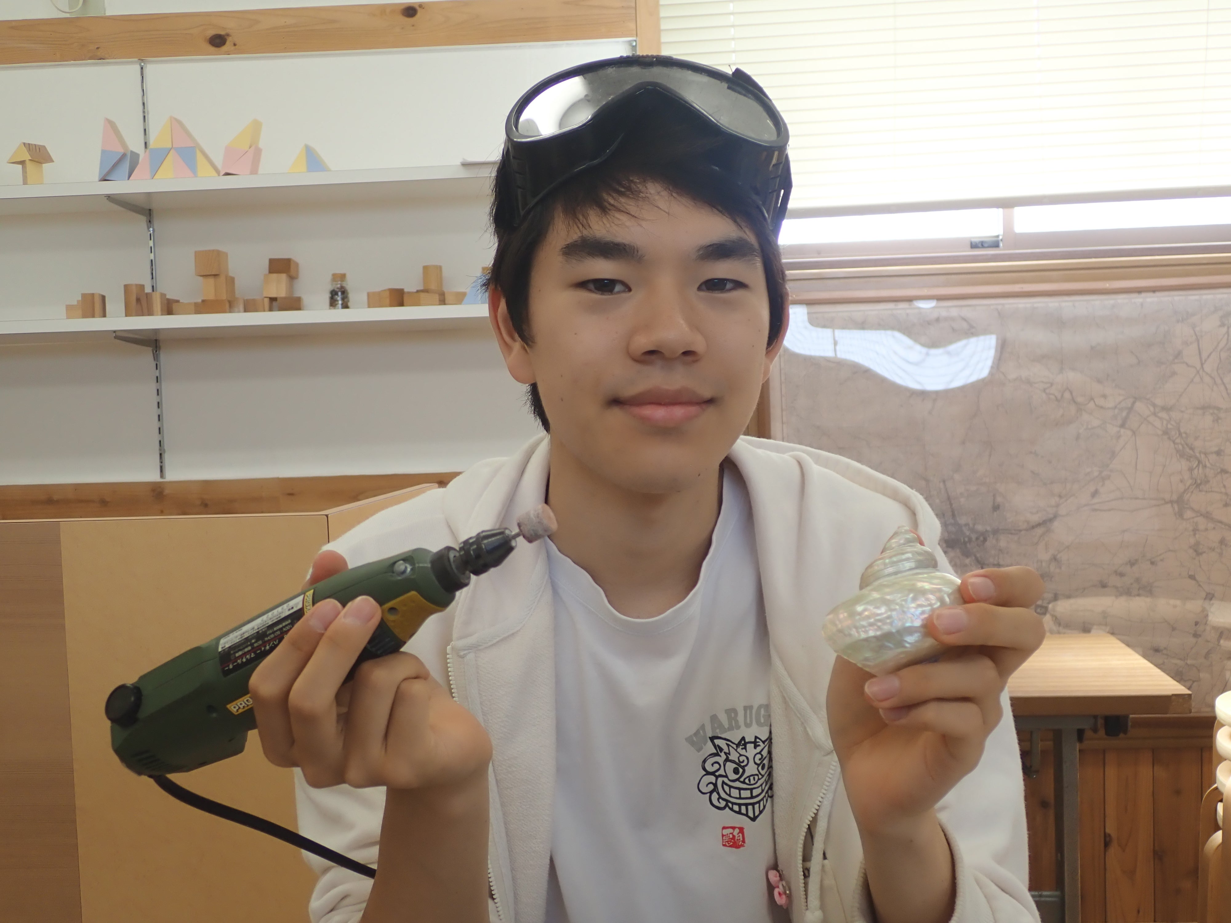 私がこの活動をしようと思ったのは、ある日市場で食べたサザエを持って帰ったことがきっかけでした。ヤコウガイという最大のサザエを磨くと美しくなることは知っていましたが、価格が高く高校生の私には買えません。そこで、サザエの内側が鮮やかに輝いてることに気づいた私は、サザエでもできるのではと加工を始めました。できあがった初作品はそれは美しく、きっとこれを使っている人がいるに違いない、その人からノウハウを学ぼうと検索します。