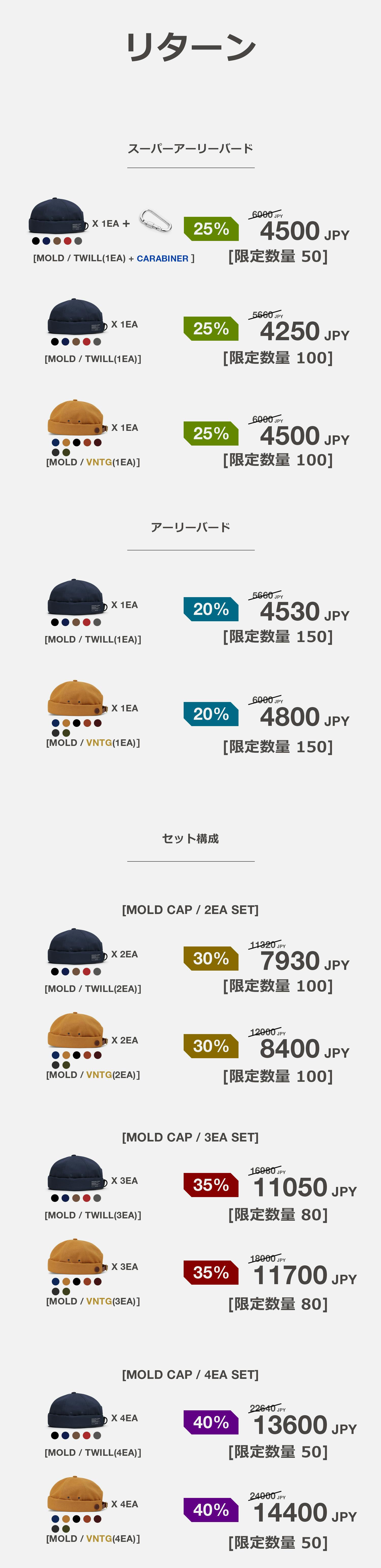 ほとんどの製品は出庫前の最終のプロセスで200度近い熱による形付けを行っております。MOLD CAPの場合接着がされておらず、綿だけで製作されていますので、形は自由に変えられますが、購入時の形やコンディションを長く維持していただくためには、上記のような保管方法をお勧めします。