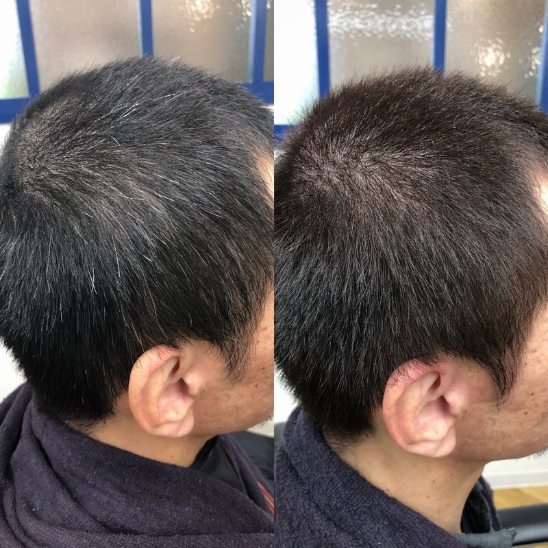 当店はグレイカラー(白髪染め)のお客様が多いです。男性の場合刈り上げなどショートスタイルが多く、白髪染めとなると頭皮にたっぷりカラー剤を塗布する事になります。なのでカラー時の頭皮への刺激と髪へのダメージの原因となるアルカリを極力抑えたカラー剤を使用しています。またカラーリングの際には大量の活性酸素が発生します。シャンプーをした後も髪や頭皮に残留しメラニンや髪を作る細胞や成長因子を傷つけます。放っておくと白髪や細毛・抜け毛の原因に。上記画像は私の頭を染めてみました。若い頃からカラー剤がしみる方でカラーをする際は、極力地肌につけずに染めてもらっていましたが、今回は地肌からベタ塗り!でもしみませんでした!