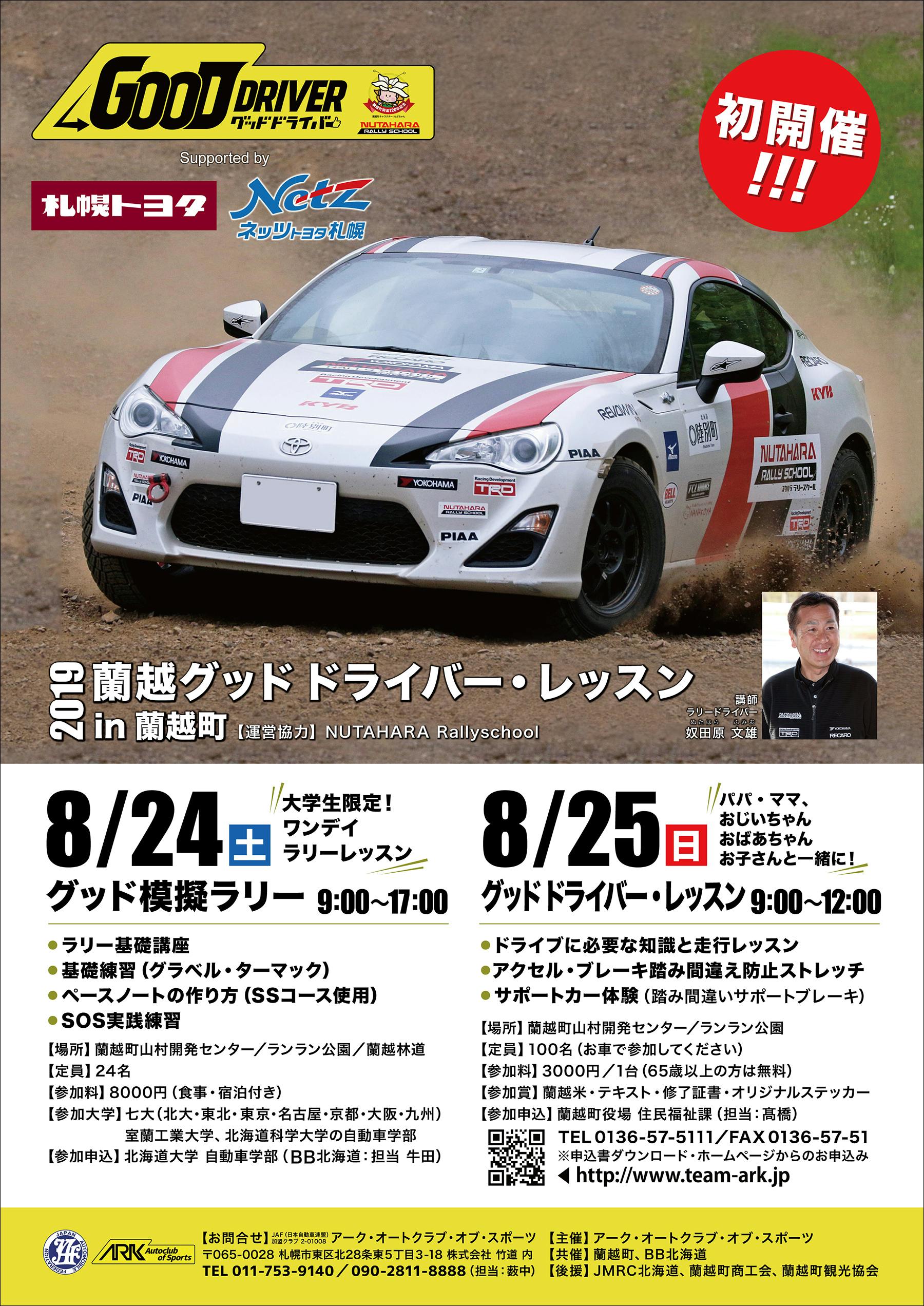 そんな想いを今までご縁のあった自動車競技チームの方々、大会開催地の方々にお話してみたところ、本当に有難いことに多くの方々から賛同をいただく事ができました。そして気が付けば賛同される皆様の声に後押しされる形で、全日本ラリー選手権の開催地である北海道蘭越町様の全面協力のもと、今年の8月末には第一回目の安全講習会である「2019 蘭越グッド ドライバー・レッスン」を開催させていただく運びとなりました。しかも記念すべき第一回目の講師には、全日本ラリー選手権で何度も年間チャンピオンに輝いている奴田原選手に引き受けていただく事になりました!!