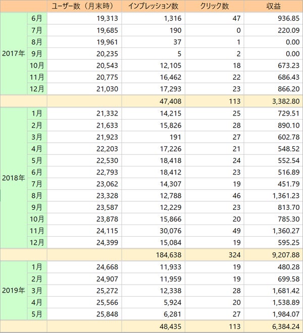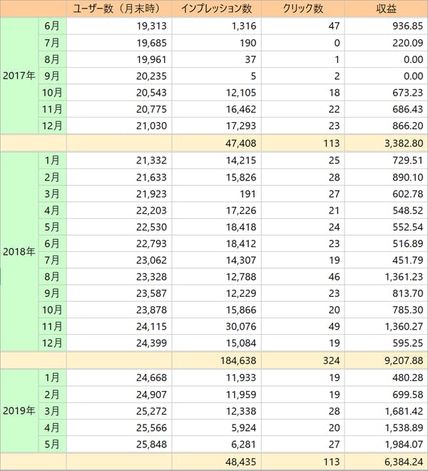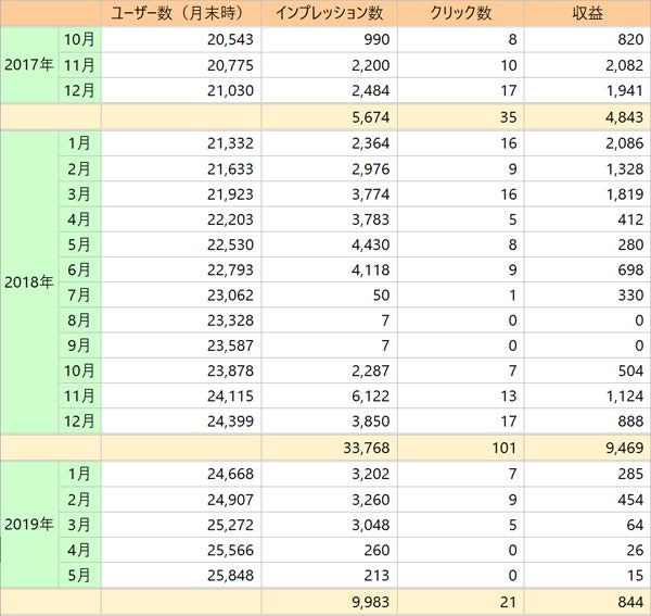 広告会社の機能的な特性から、2017年6月までしかさかのぼれませんでしたが、上記の数値は、広告会社提供の管理画面から見られるインプレッション数(広告表示数)、クリック数、収益(広告報酬)で、ユーザー数はGoogle アナリティクスで月末時点の新規ユーザー数を取ってきたものになります。
