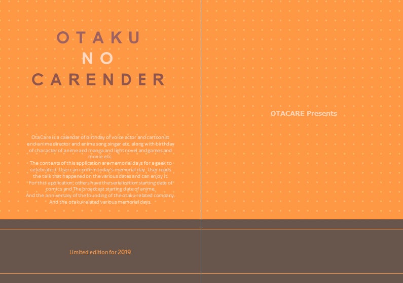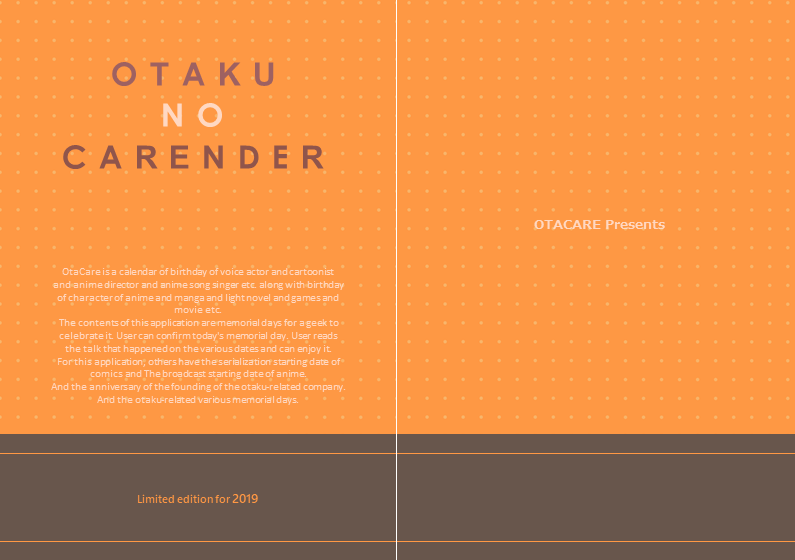 また、このような作中の架空の出来事をカレンダー的にまとめたコンテンツは、「オタカレ」を除けば、Wikipediaの日付欄にわずかな数の似たような記述がある程度で、他では全く見られない、当アプリの唯一無二のものだと自負しています。