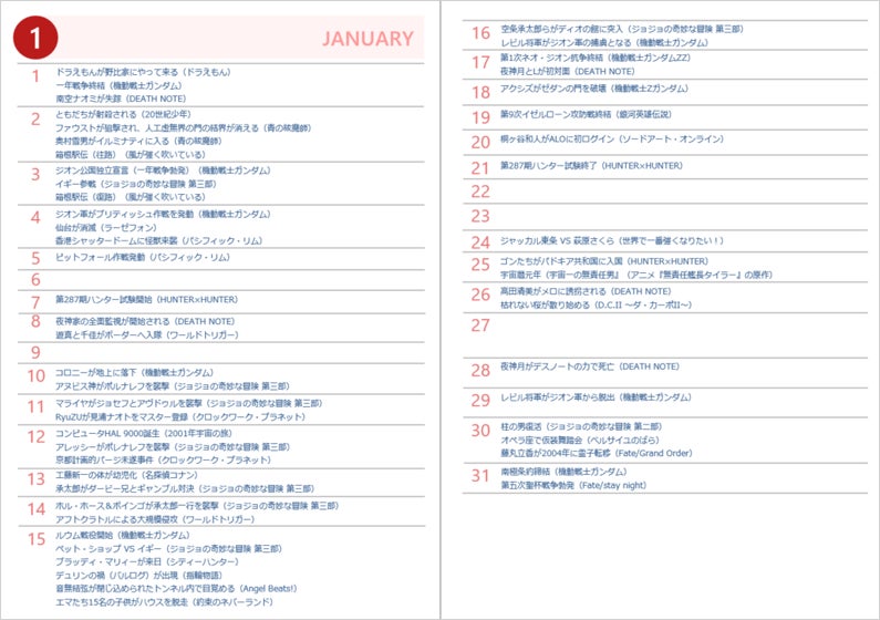 声優やキャラクター誕生日を除いた出来事・開始日・記念日系の項目だけをピックアップして掲載したカレンダー冊子です。
