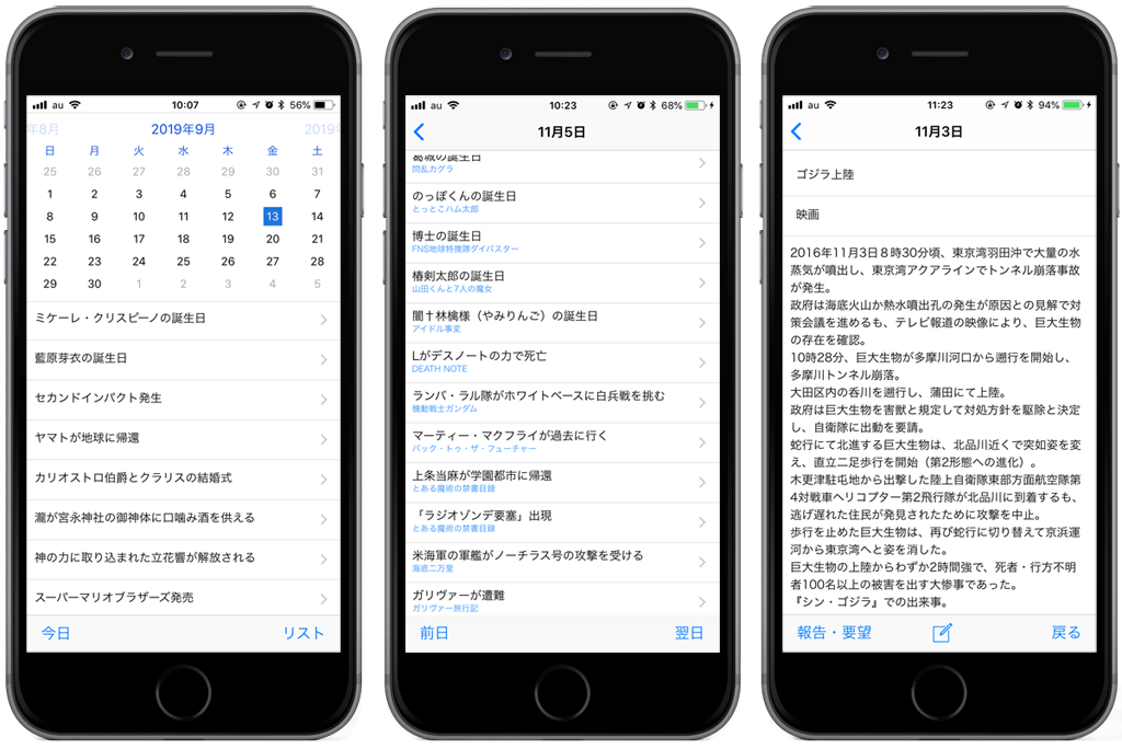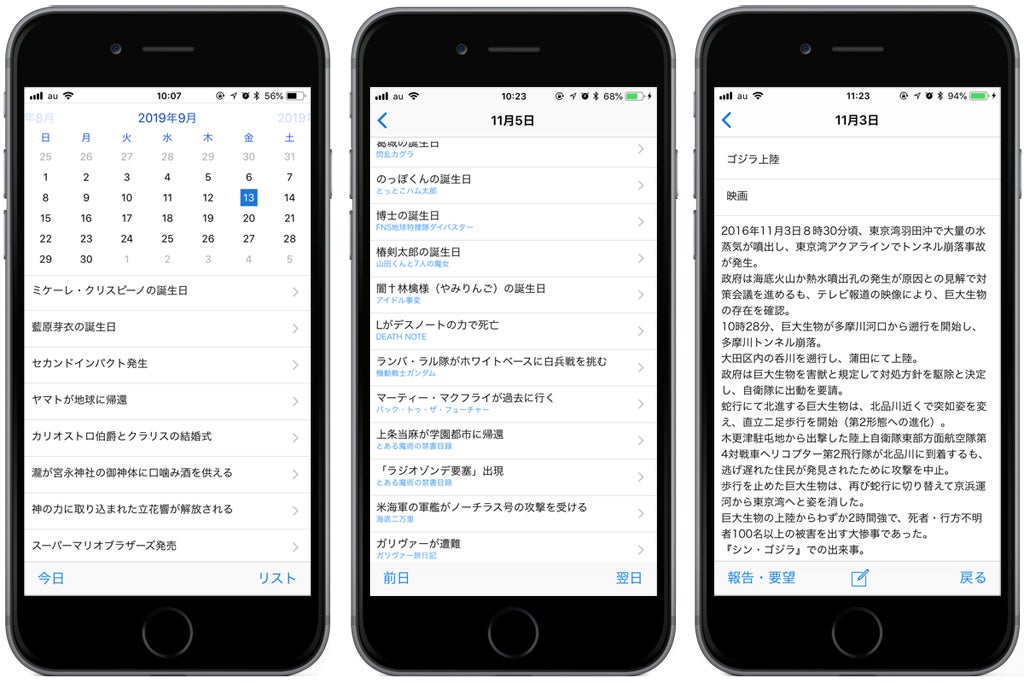 カレンダーから日付を指定したり、日付順のリストページをめくっていったりしながら、その日に起きた出来事やキャラクターの誕生日など「今日は何の日?」が見られます。
