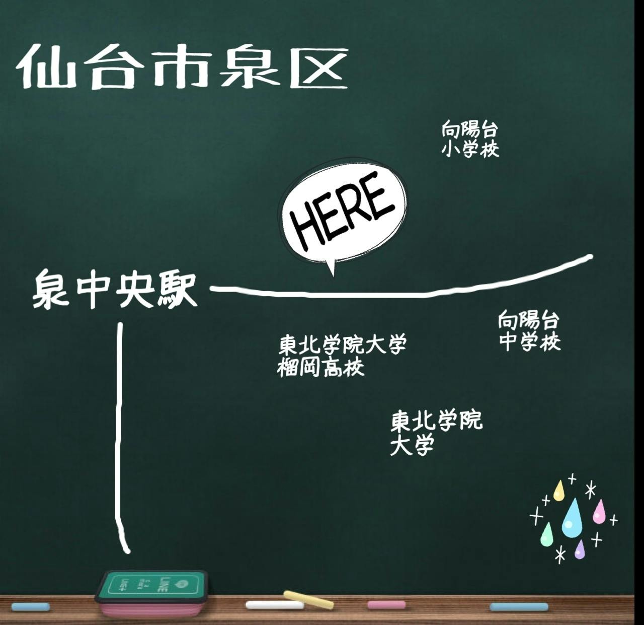 私たちの地域は、仙台市泉区向陽台学区です。泉区中心部までは車で10分程度、アクセスも良いところですが、古い住宅も多い住宅街です。近くには東北学院大学をはじめ小中高校もあり、児童生徒は多く見られるものの、学習塾のような教育機関や学生の集まって活動する場所にまだまだ不足を感じる地域です。
