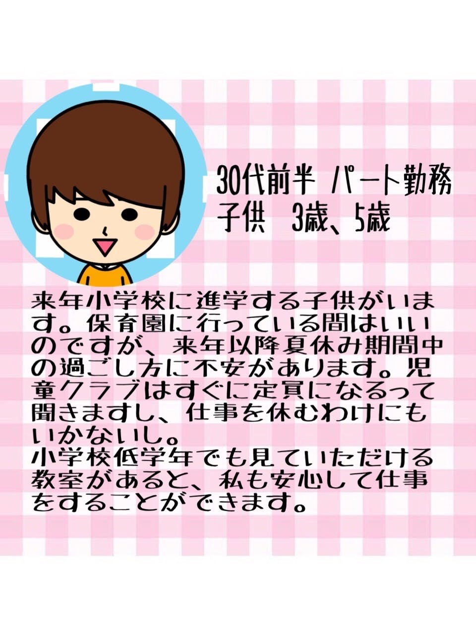 未就学の子供達は児童館や子育て応援施設へと出かけることはできますが、小学生に進学すると今まで行っていたところへは足が向かない家庭を多く見てきました。また、子供達を保育園に預けていると小学校に進学したら子供は保育園よりも早く帰ってくる。放課後はどうしたらいいかというママ友の悩みも聞くようになりました。子供を保育園に預けて仕事をする立場になってみると、実際に小学校進学後の子供達の居場所作りというのはとても重要でありながらまだまだ、需要に対して供給できる場所が足りないのでは?と3年後、自分の子供が小学校進学したことを想像し現在の環境に不安も覚えました。まずは私が、この地域の同様な家庭のチカラになりたい!その第一人者として保育園から小学生への橋渡しをできないかと考え現在の企画立ち上げとなりました。