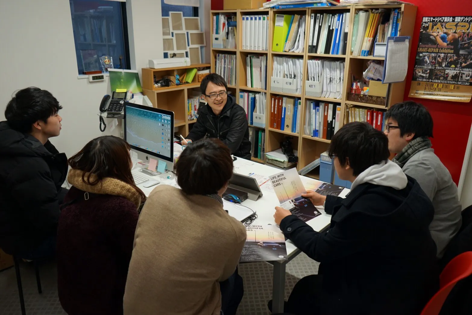 <秋田県秋田市にあるビューティフルカーズ 本店にて村上篤さんのお話を聴いている様子>