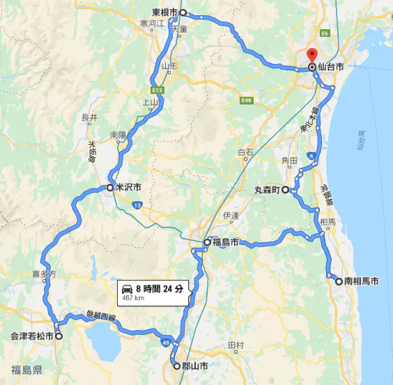 会津若松市→米沢市→東根市→仙台市