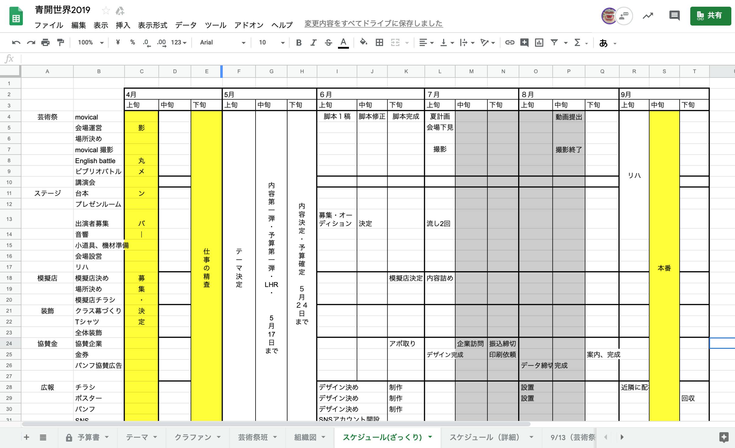 学園祭関連の資料はスプレッドシートで管理。毎年資料が蓄積されていく。