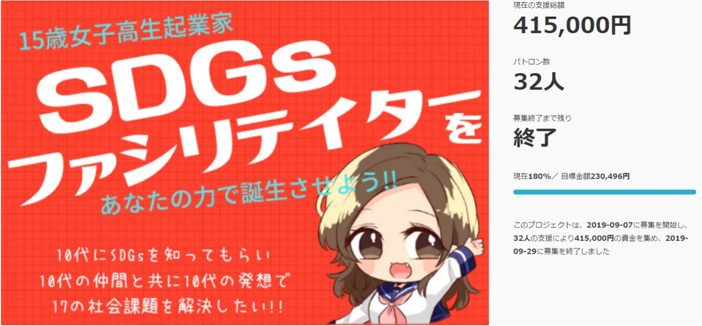 2019/09/29 07:41#本日最終日!あなたの応援が世界を変える、15歳女子高校生起業家の挑戦!!目標金額達成率178%突破!ほんとにありがとうございます!!15歳女子高校生起業家細川愛倫のクラウドファンディングも本日で終了です。ですが、ここからがスタートです!現在、SDGsファシリテーターの試験を11月に受けに行く予定で進んでおります。資格取得後リターンで支援いただいた方への報告メッセージや講演の開催など、忙しくなりそうですが、今日のクラウドファンディング最終日を盛り上げ最高のスタートを切りたいと思います!クラウドファンディング最終日、全力で走り切りたいと思いますので、最後にお力をおかしください。fcaebookでのいいね、シェア、Twitterでのツイートで情報拡散よろしくお願いいたします。https://camp-fire.jp/projects/view/17207115歳の女子高校生起業家をあなたの力でSDGsファシリテーターにしよう!SDGsの17個の社会課題を10代と共有し解決するために、国際バカロレアを取得する15歳の女子高校生起業家になる私がSDGsファシリテーターになります!若い世代には同じ目線で話ができる同世代のファシリテーターがいることで、SDGsが掲げる17個の社会課題を10代に知ってもらえる環境が創れます。10代にSDGsを知ってもらい、10代の仲間と共に10代の発想で17の社会課題を解決します。よろしくお願いいたします。https://camp-fire.jp/projects/view/17207115歳女子高校生起業家細川愛倫クラウドファンディングプロジェクト運営事務局・細川愛倫(ほそかわあいりん)15歳女子高校生 国際バカロレアを取得予定2019年12月までにSDGsファシリテイター取得&起業予定SDGs=国連が2030年までに解決すると掲げた17の社会課題10代の目線で考え解決策を提案するためにSDGsファシリテイターになり10代にSDGsを広めます!10代の力で世界を変えるをテーマに10代だからこそできることを考える仲間募集中!・持続可能な開発目標(SDGs)とは→https://www.mofa.go.jp/mofaj/gaiko/oda/sdgs/about/index.html【クラウドファンディングコミュニティ:コクラ】細川愛倫さんの最新情報をはじめ、クラウドファンディングの最新情報やノウハウが学べるコミュニティ「コクラ」への参加はこちらからLINE@に登録するだけ!クラウドファンディングに挑戦したい人はもちろん、挑戦している方のサポートもしています.→https://line.me/R/ti/p/%40eby9868z もっと見る